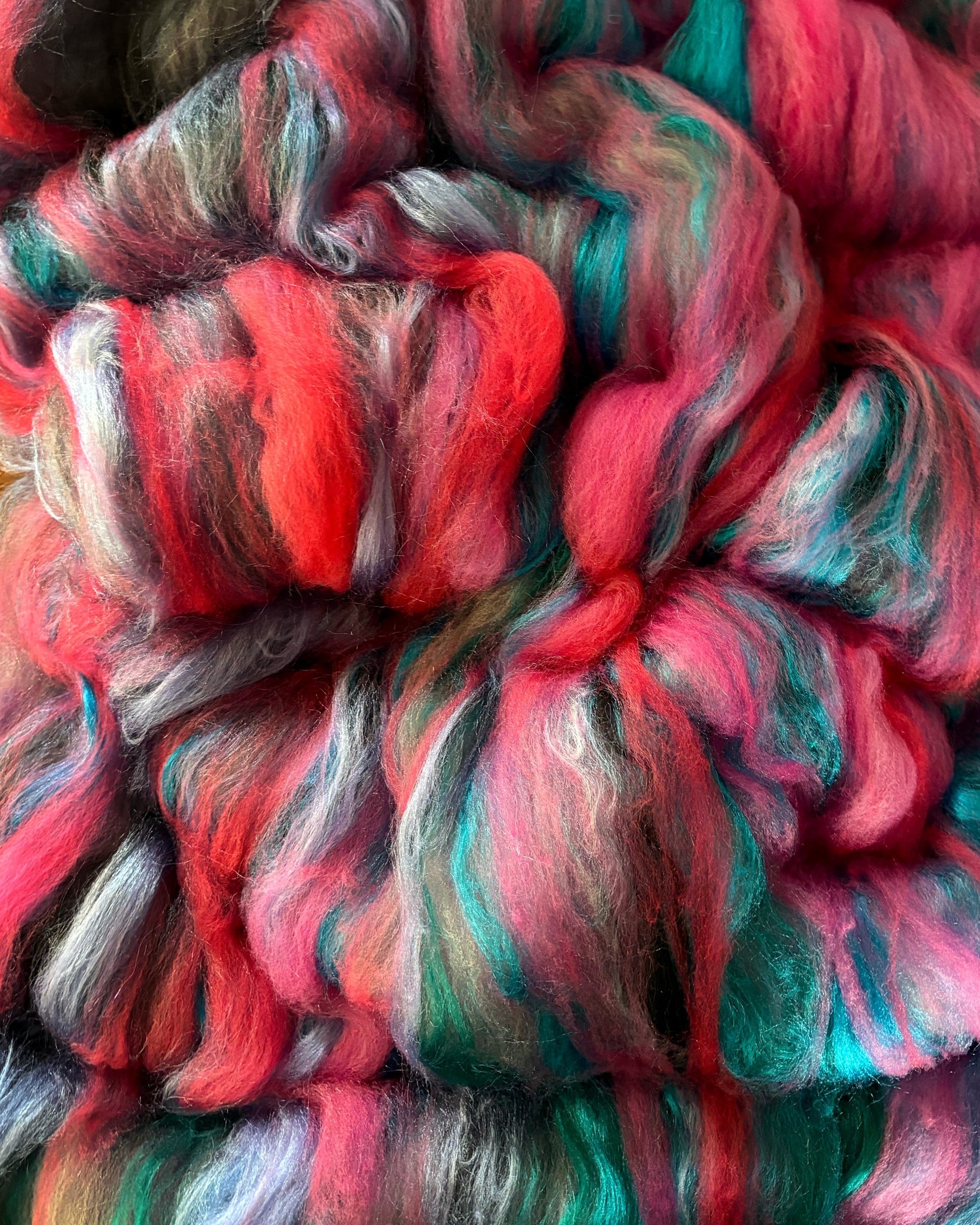 Layered within are streaks of silk that shimmer like starlight traced across ancient orbits—glimpses of long-lost systems still glowing at the edge of memory. Threads of faux cashmere curl through like the last flare of a dying star, warm and bright and impossibly rich. Beneath it all, bamboo pulses with alien energy—deep as asteroid shadows, sharp as mineral flame—giving the batt a sense of depth that feels planetary in scale.