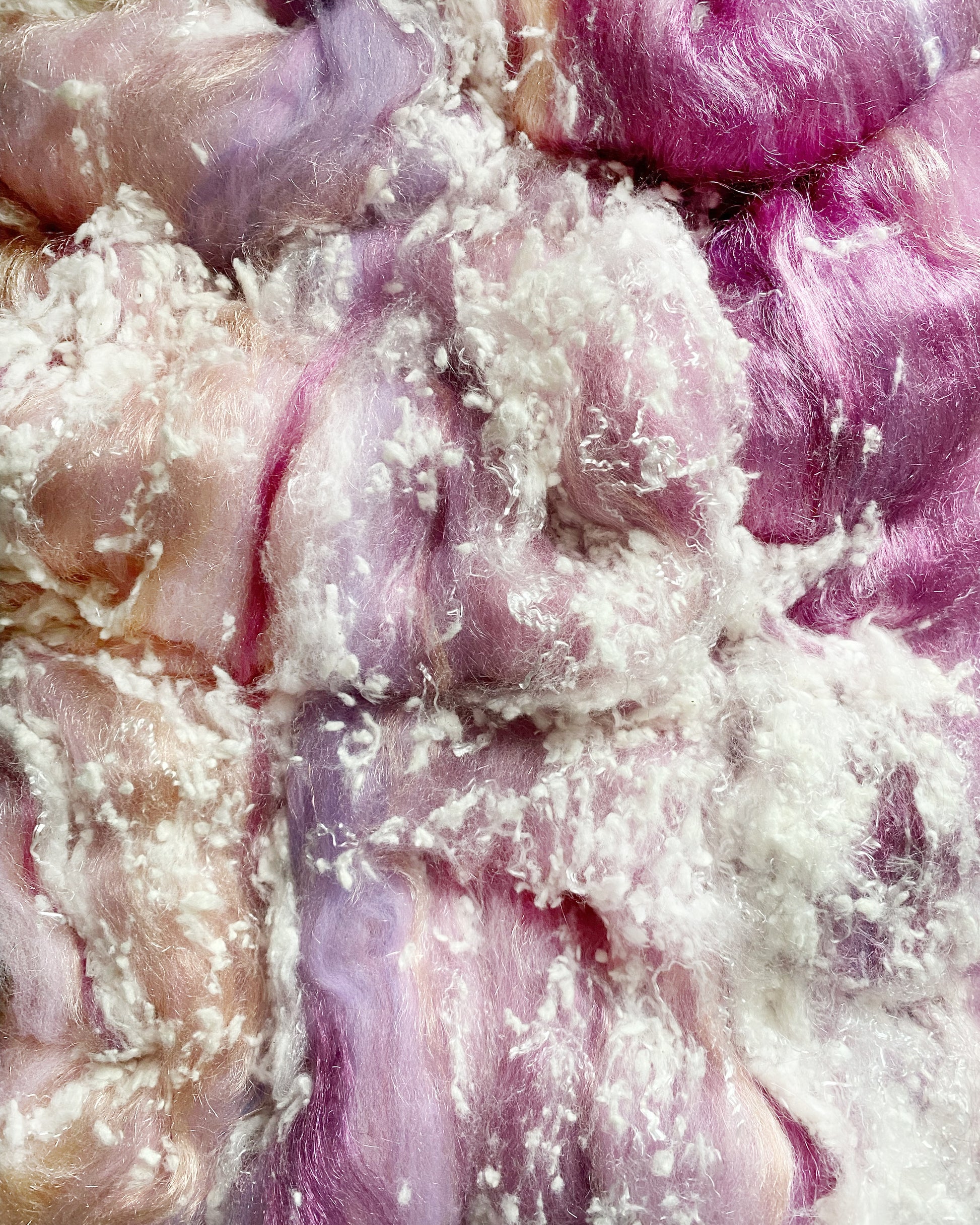 Embrace the enchanting world of Glinda with our Glinda Batt. Lovingly crafted from premium Rambouillet wool, this batt radiates with the warmth and elegance of the beloved Good Witch of the South. The gradient pink base is blended with pink firestar sparkle, pink and periwinkle faux cashmere, white lyocell, and cotton nepps, creating a dazzling array of colors and textures reminiscent of Glinda's graceful presence and timeless beauty. Each spin with this batt will transport you to the dazzling city of the Emeralds, where dreams come true and magic fills the air.