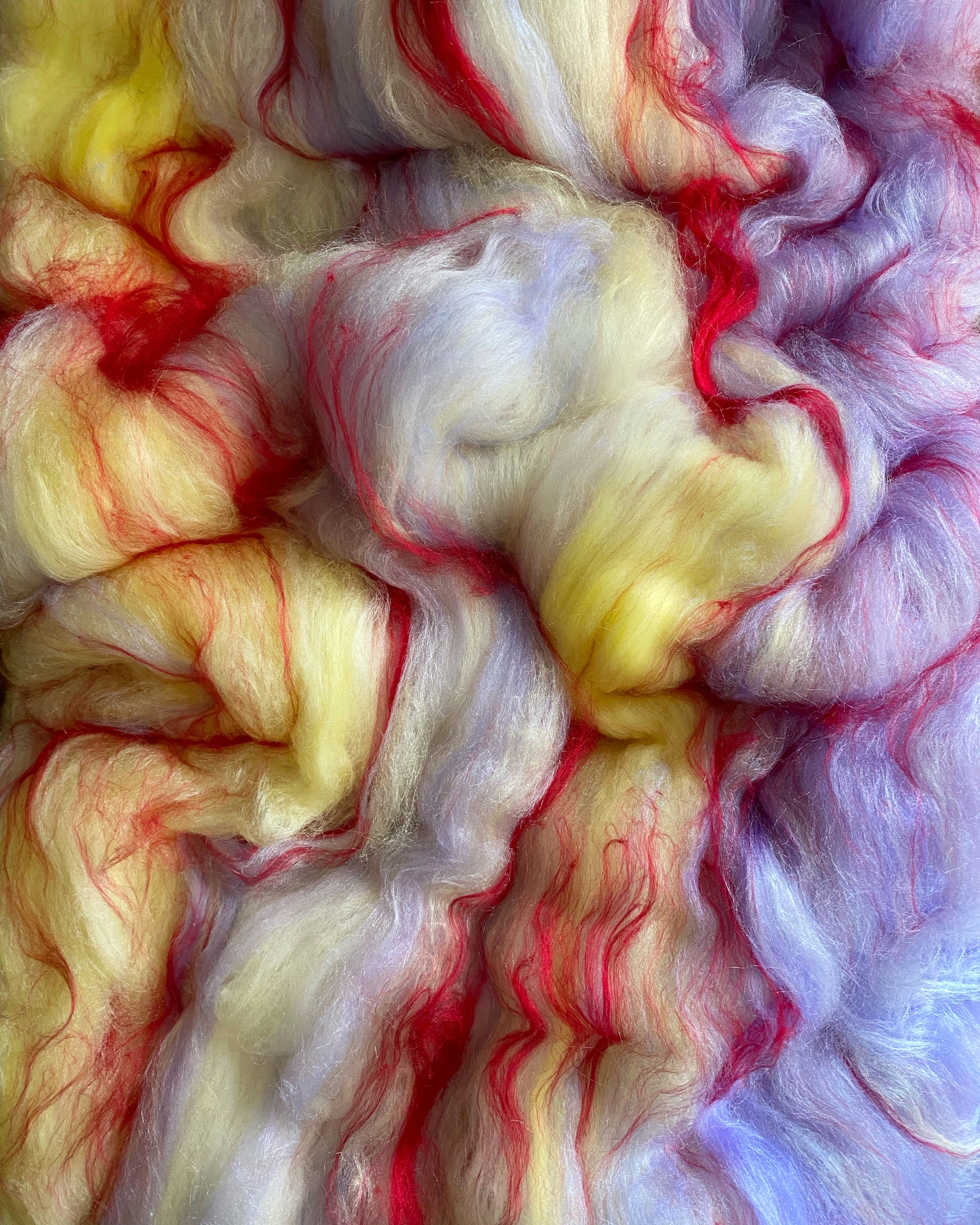 Delicate wisps of iris and lemon drop silk add a smooth, flowing texture, while periwinkle and sunlit citrus nylon weave through like the last splash of light in a glass of ice-cold lemonade. Finally, a touch of rich red bamboo deepens the color contrast, giving this batt a bold, punchy finish. Whether spun for a gradient effect or blended into a playful mix, Hibiscus Lemonade is a refreshing burst of fiber joy, perfect for bringing a little sunshine to your next project!