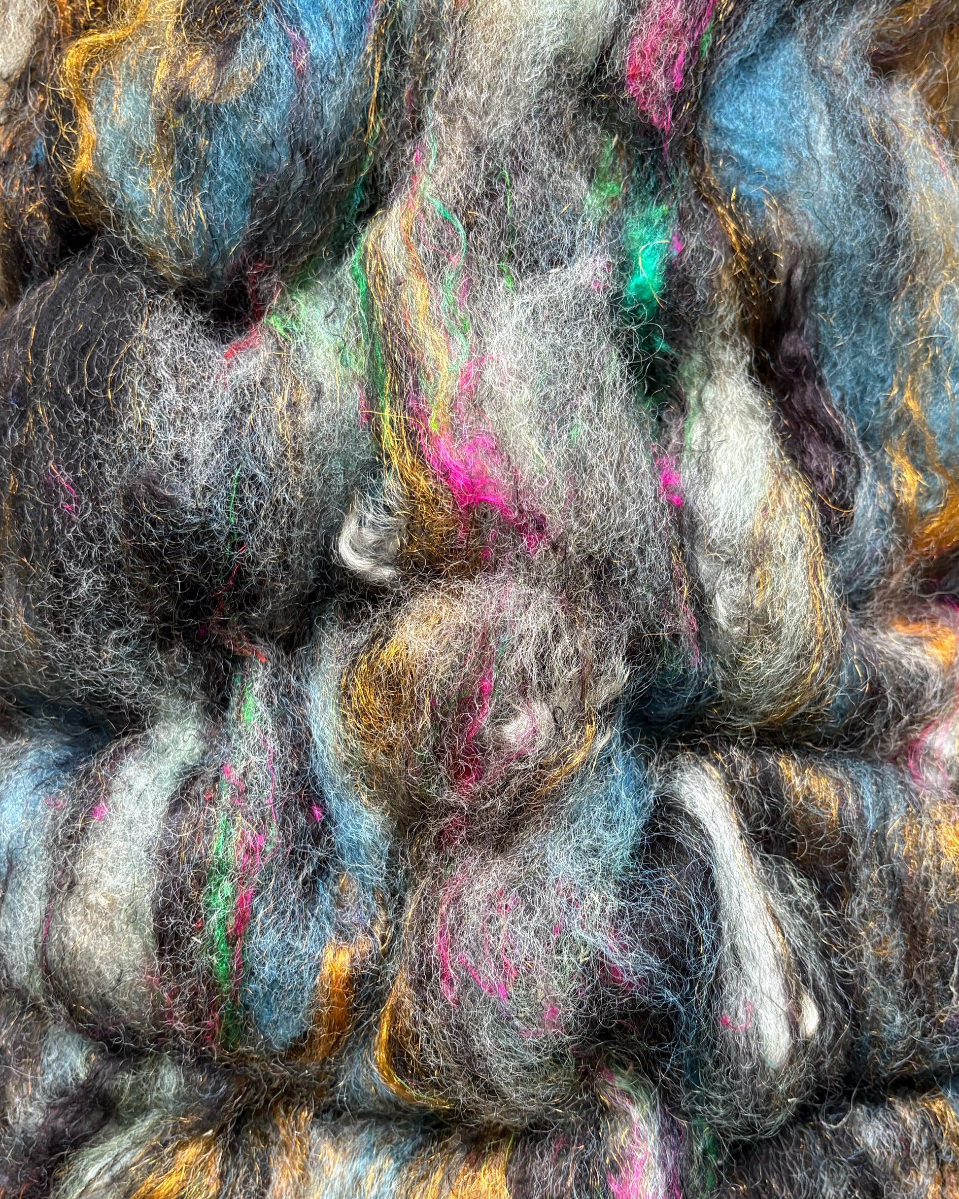 Whether you’re spinning for structure or mood, this batt will hold its ground—and add just enough shimmer to remind you that steel can sparkle, too.