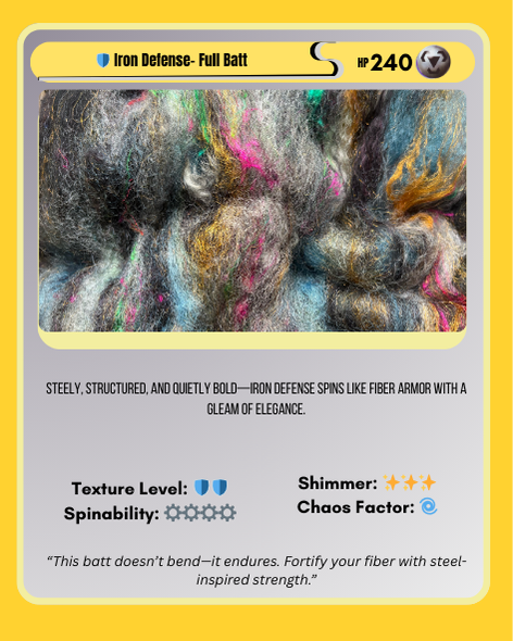 The Iron Defense Full Batt is a fortress in fiber—a 3-ounce carded batt that spins like strength itself. Layered with brooding greys, mysterious blues, and flickers of metal-bright gold, it’s equal parts defense mechanism and design statement.