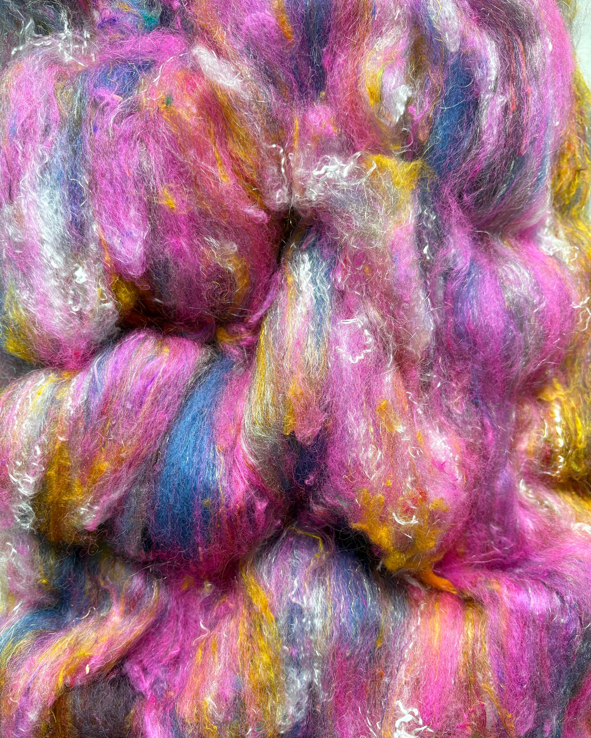 Each batt is layered in a moon-kissed palette of starlit lilac, comet pink, and dusky sky blue, with hidden flashes of bright sun-gold from the yellow sari silk. The pink sari silk adds whimsical glimmer, white lyocell softens the texture with a ghostly glow, and moon-grey Firestar glimmers like captured stardust.