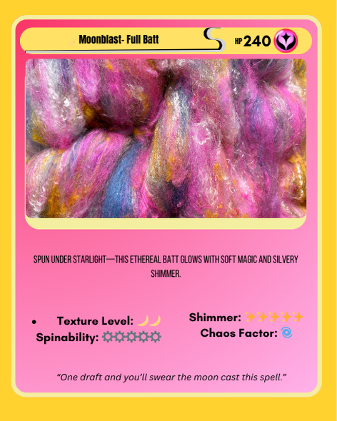 The Moonblast Full Batt is a 3-ounce, ready-to-spin force of nature (and moonlight). Carefully carded for drama and flow, it’s the fiber version of a high-damage Fairy-type move—soft, radiant, and unexpectedly powerful.
