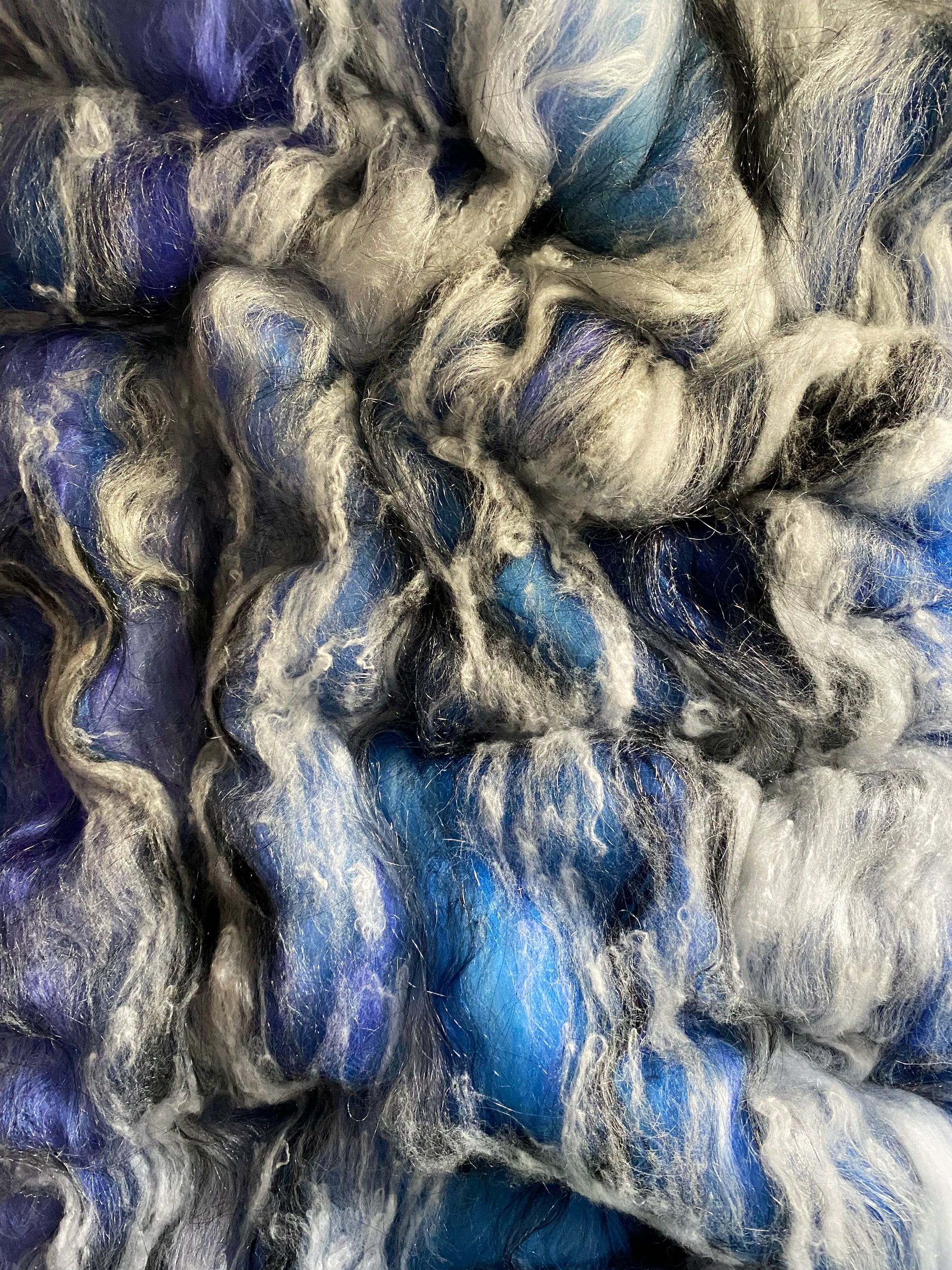 Photon is inspired by the energy manipulating superhero. This fiber batt has a gradient blue base with black and white highlights.