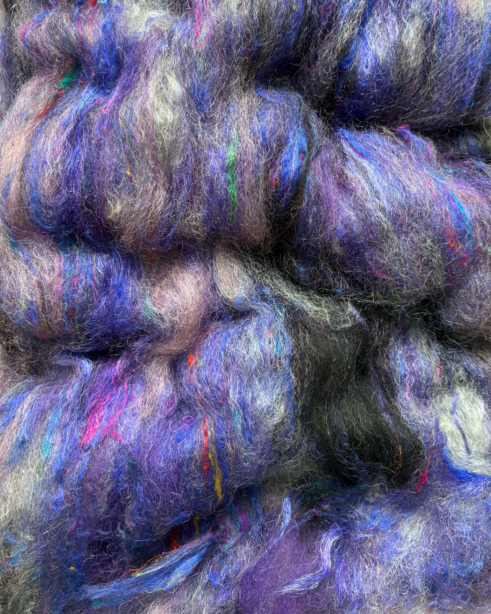 Carded with Finn wool in deep phantom purple and Wensleydale in midnight plum, grounded by black Merino and fog-grey Romney locks, this batt is rich with haunted color. Streaks of Kasib Berry Firestar flash through the shadows, lending a spectral glow, while blue sari silk weaves a thread of ghostly resonance through the gloom.
