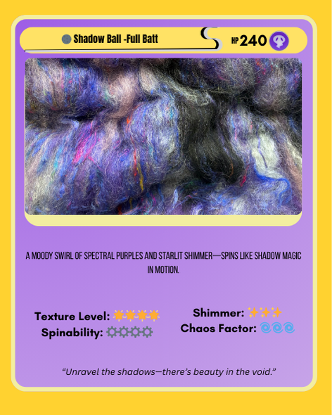 The Shadow Ball Full Batt is 3 ounces of ghostly elegance—mysterious, multilayered, and brimming with spectral texture. It’s fiber magic for spinners who like their yarns dark, nuanced, and full of untold stories.