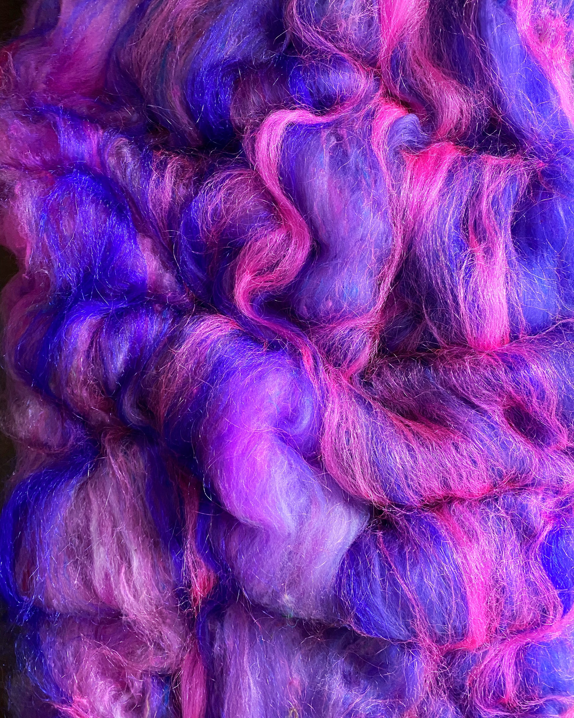 The base is made from luxurious Rambouillet wool, renowned for its softness and resilience, ideal for spinning and felting. We've added silk, sari silk, bamboo, and a dash of Firestar, giving it that extra sparkle and texture that reflects the shimmering allure of the Zaunite underworld. Each fiber dances with life and vibrancy, perfect for creating yarns or projects that embody raw energy, mystery, and a hint of danger. Whether you're spinning a story of power and resilience or embracing the thrill of the unknown, this batt is ready to bring your creative visions to life.