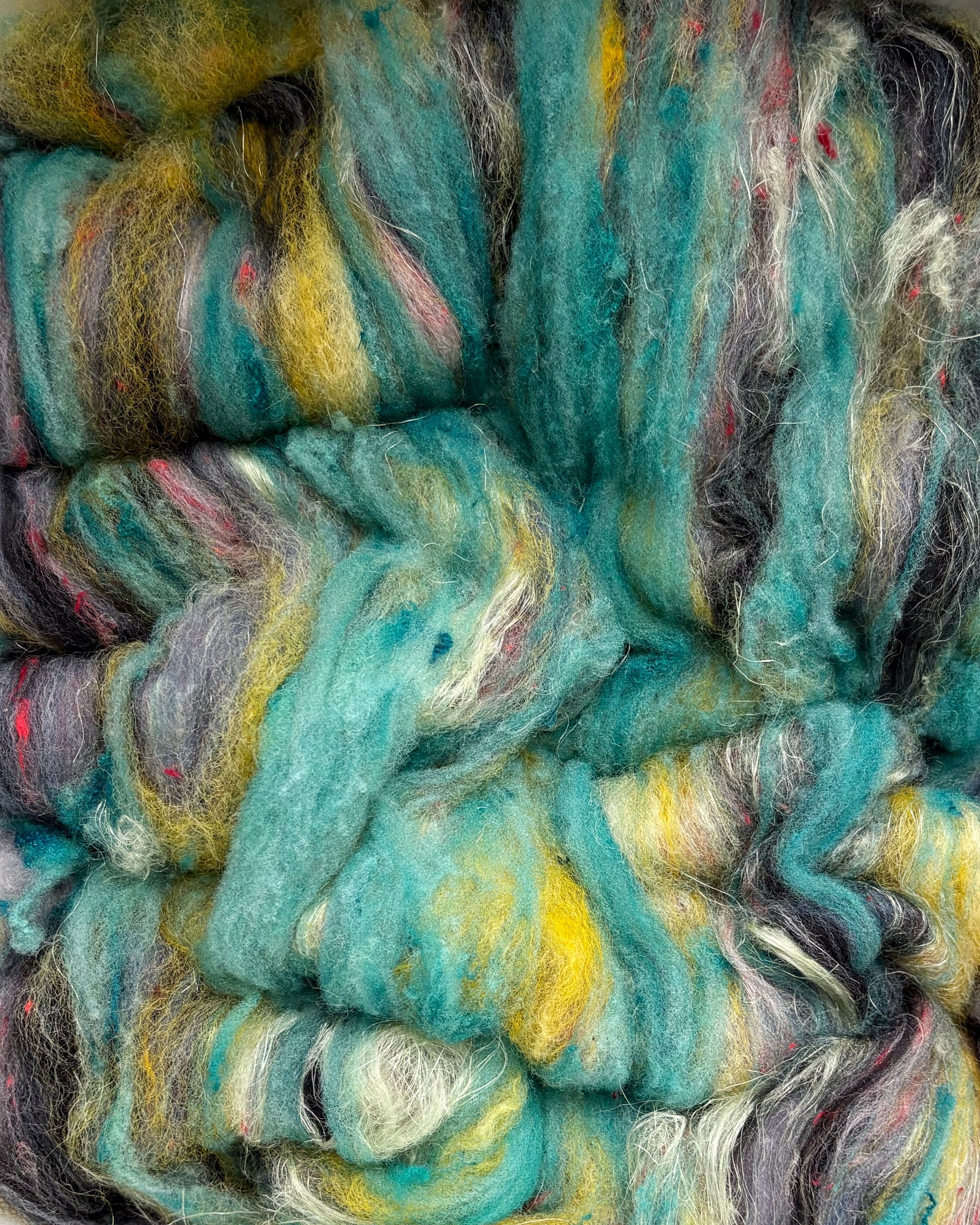 Crafted in two passes to preserve vibrant texture and layered depth, this batt spins into yarn that feels like overgrowth creeping through skyscrapers. Unexpectedly serene, powerfully post-human—this one’s for the dreamers who find beauty in the breakdown.
