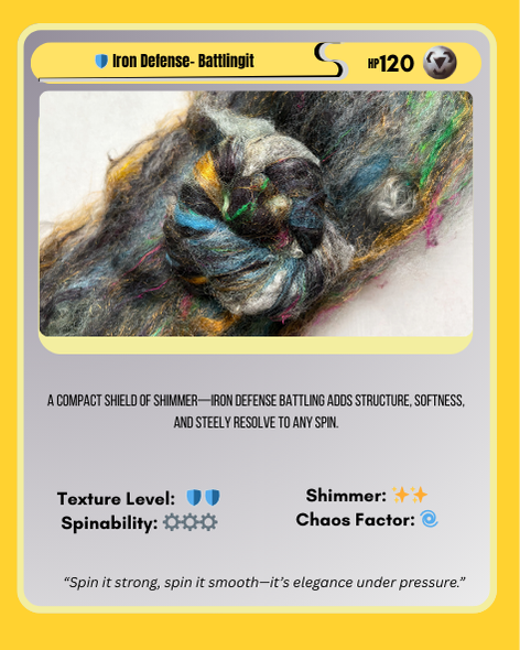 When you need a fiber shield with tactical weight and quiet strength, reach for an Iron Defense Battling. This 1.5-ounce batt is a dense pocket of shadows, sparks, and steadfast color—perfect for sampling or adding structure to your yarn arsenal.