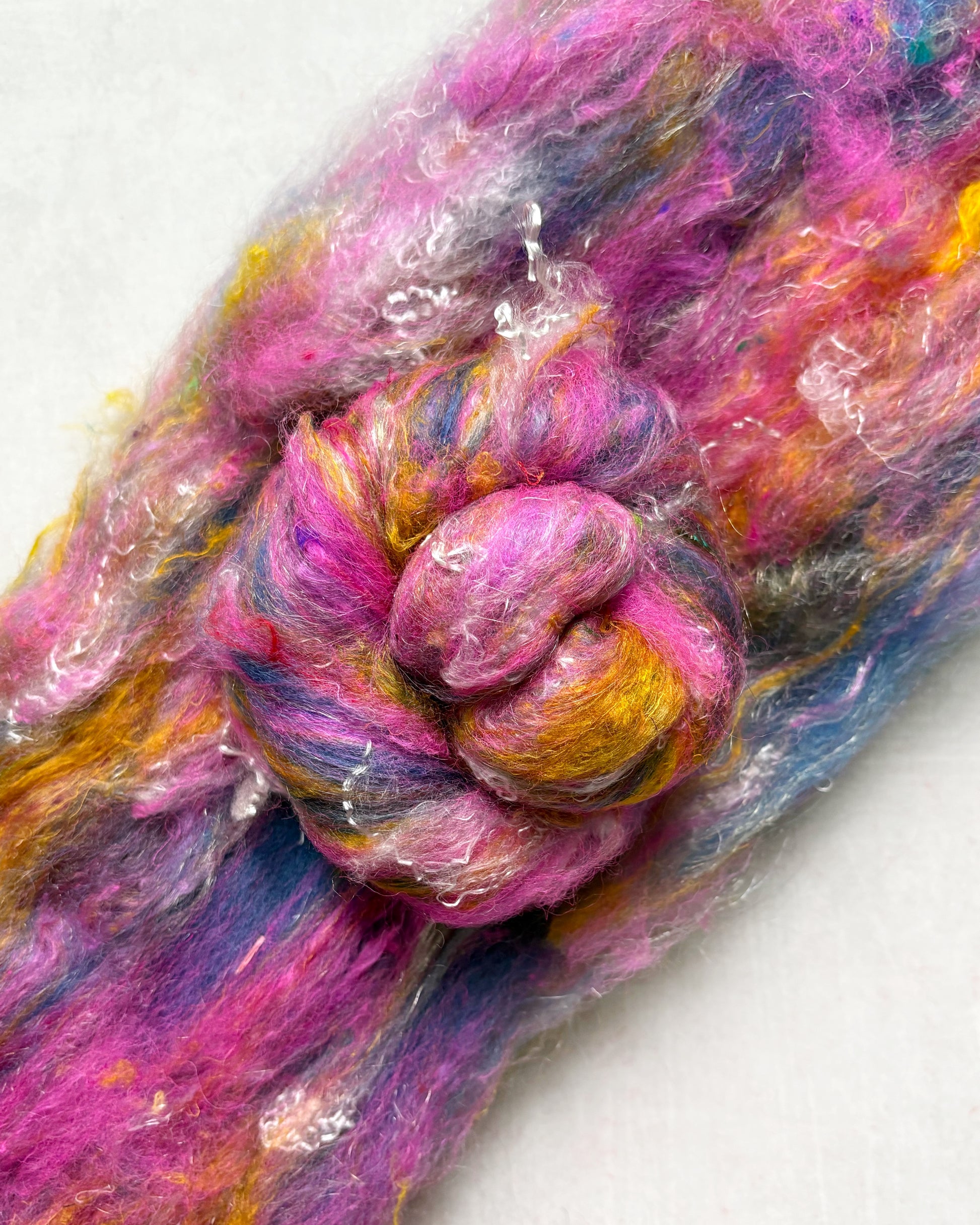 Use a quick attack with a Moonblast Battling—1.5 ounces of punchy, fairy-aligned fiber magic. This bite-sized batt is the perfect sampling of color and texture for spinners who like to test, play, or mix-and-match.