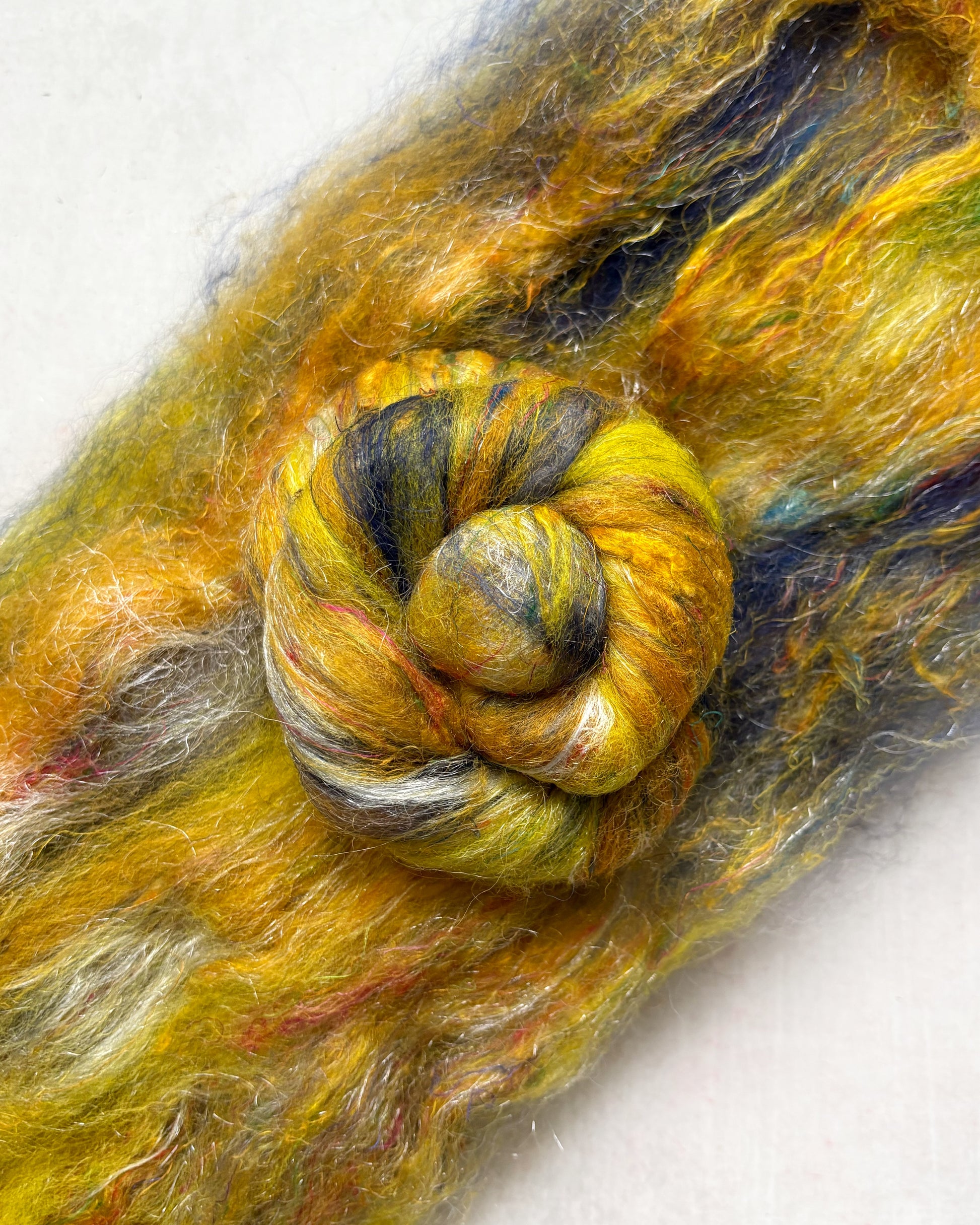 Ingredients: Finn wool, Wensleydale wool, Sari Silk, Romney Locks, Firestar