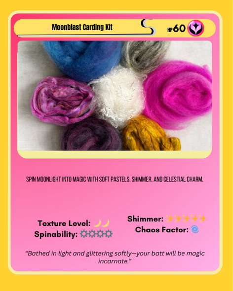 Let your batt-building evolve with the Moonblast Carding Kit—a 3-ounce bundle of celestial charm. Inspired by the iconic Fairy-type move, this kit offers a radiant blend of cosmic and sweet, perfect for fiber artists ready to shape their own magic.