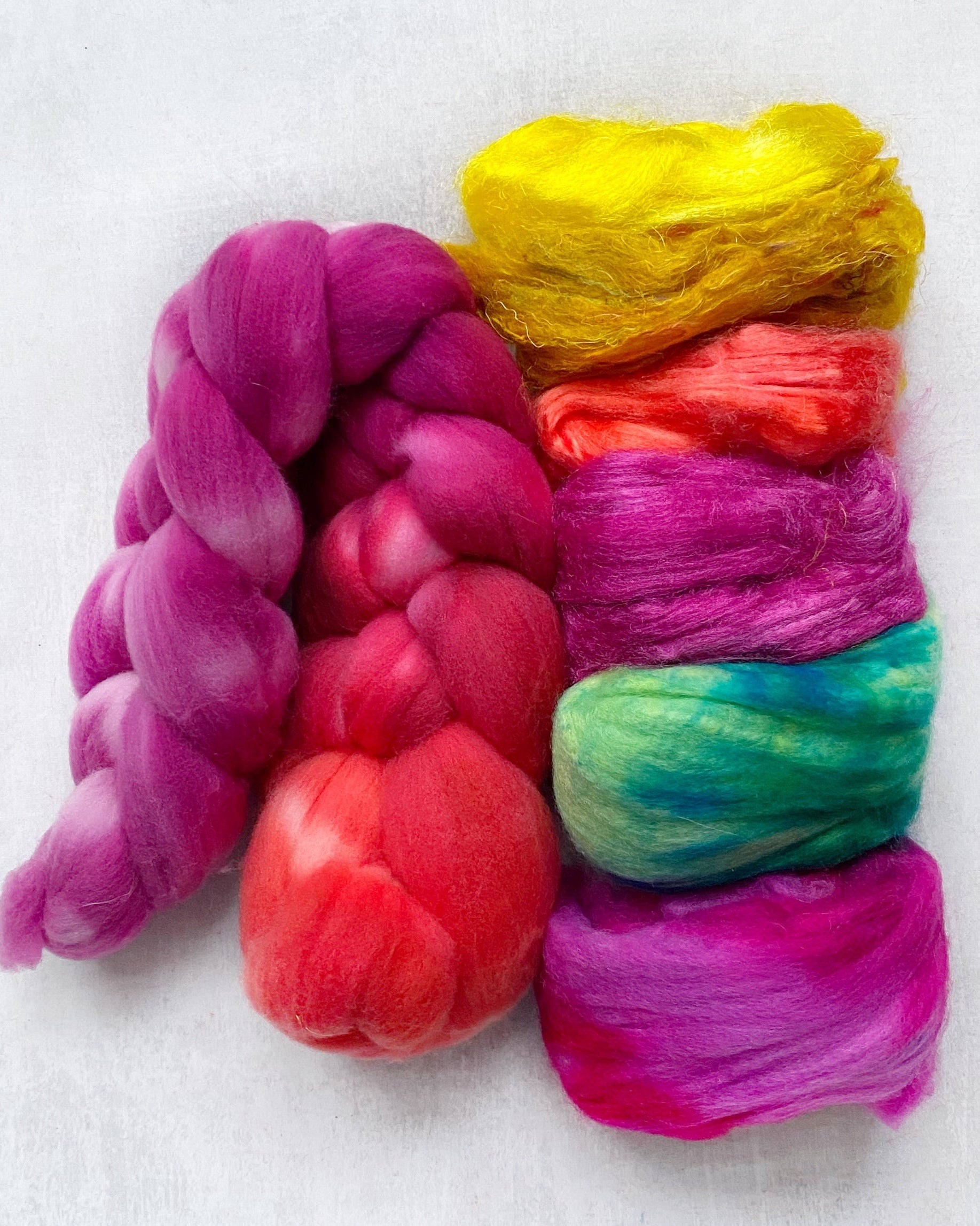 Carding kits provide you with a themed palette of color and texture to make your own creations. These are the same fibers I use when carding batts but don't be limited to batts, these kits can be used on blending boards, for felting, or adding to your stash of carding bits.