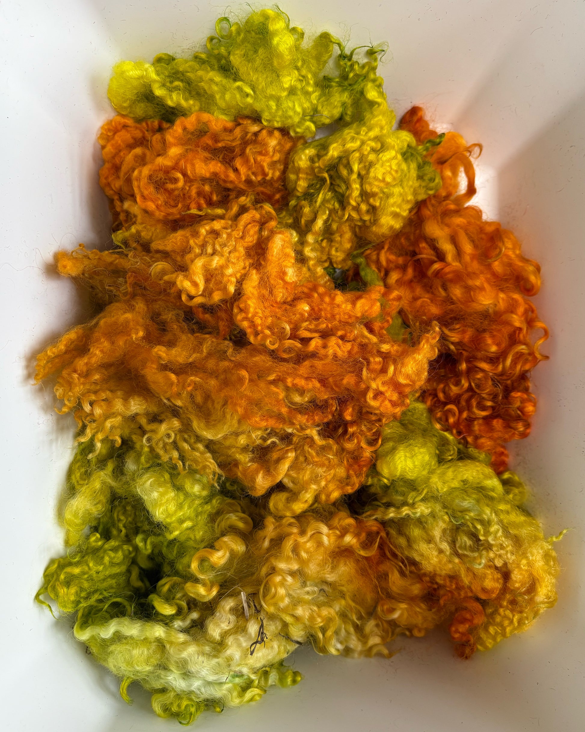 Border Leicester is a versatile longwool with crisp texture and beautiful luster. Washed wool is good for spinning as is, blending with your own fibers, dyeing or felting.