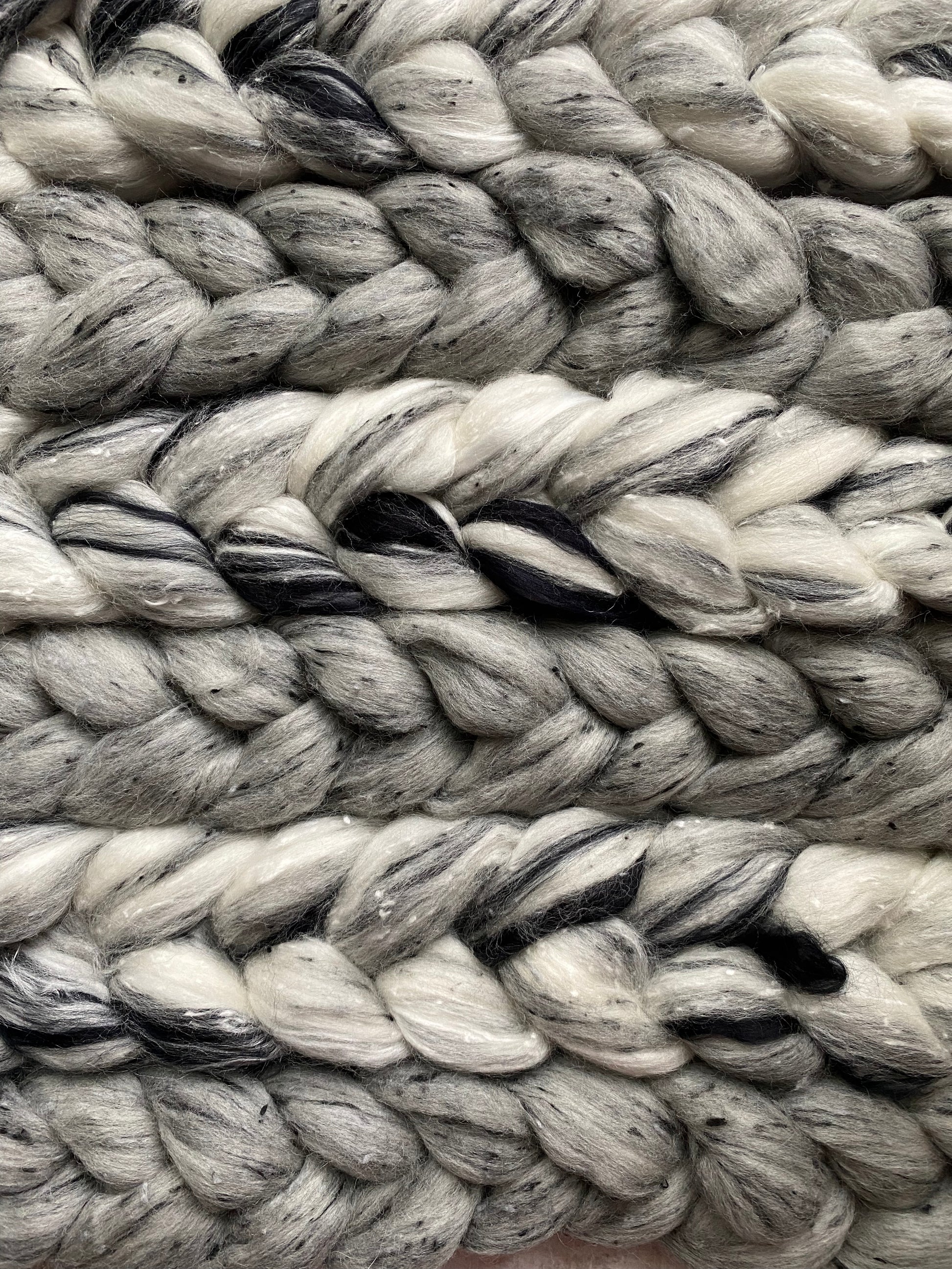 In the flickering shadows of a forgotten lab, she awakens—a creation of beauty and horror, stitched from dreams and nightmares. The Bride of Frankenstein plying pair captures this iconic duality with a grey tweed braid that whispers of stormy skies and a black and white tweed of wool and bamboo, echoing the electrifying streaks in her hair. As you spin, you’ll weave a tale of longing and defiance, a yarn that dances between light and dark, stitched with the haunting elegance of an unforgettable bride who was never meant to be. Spin the essence of a creature born of lightning and longing.