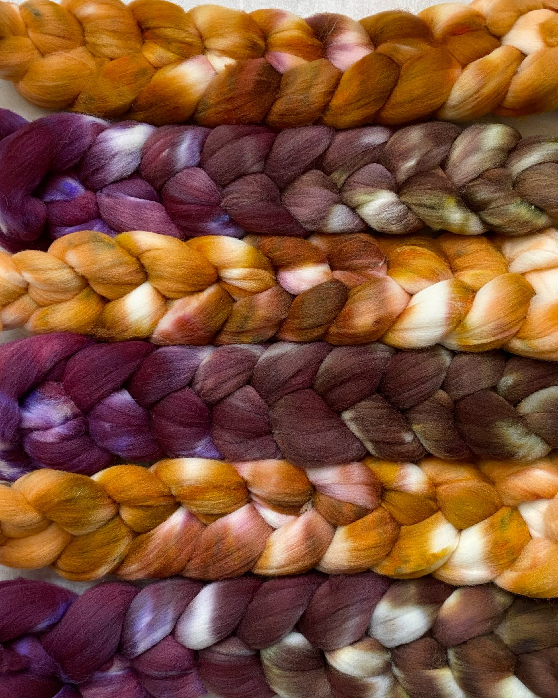 The first braid is a molten dark chocolate to spiced berry reduction gradient, reminiscent of a rich chocolate ganache laced with hints of dark fruit and warm undertones. The second braid is a drizzle of buttery maple caramel, swirling with toasted sugar and golden toffee notes. Together, these fibers blend into a warm, complex yarn with an irresistible depth of color—just like the smooth, lingering finish of a perfectly aged whiskey cake.