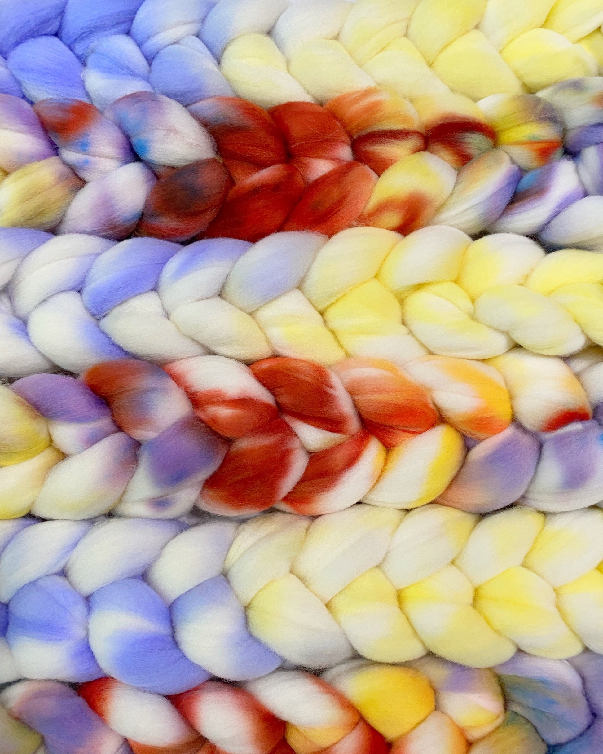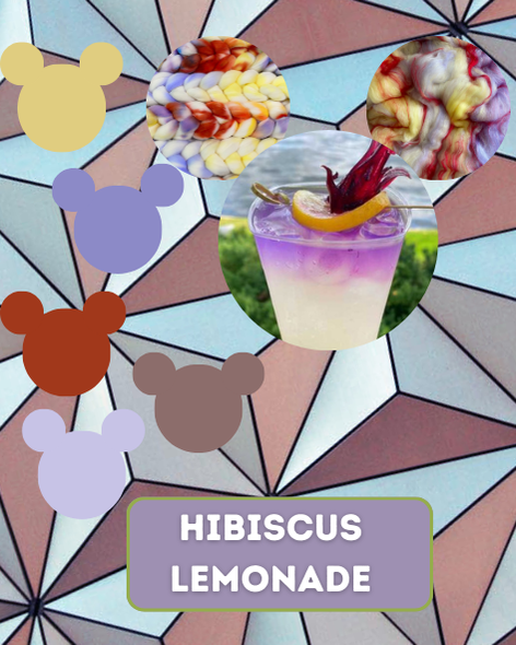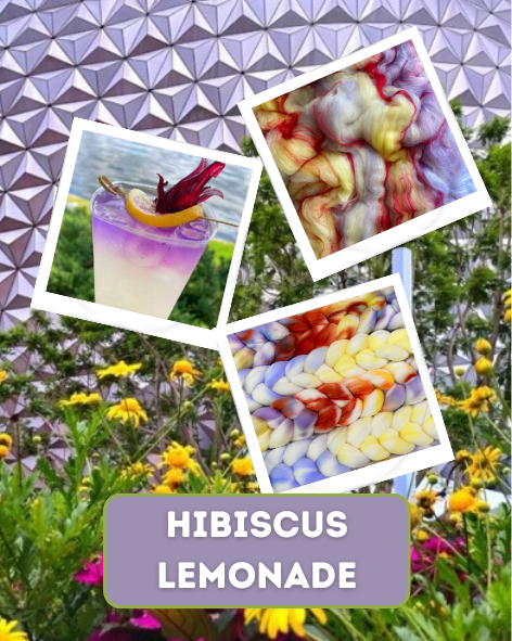The first braid flows in a gradient of deep hibiscus blossom steeped into golden citrus, blending rich floral purples into the light, sunny brightness of fresh-squeezed lemon. The second braid shakes things up with a medley of crushed wild berries, tangy lemon zest, and a pop of hibiscus punch, mirroring the swirling hues of a fruit-filled summer refreshment. Together, these braids spin into a fiber delight that is as energizing and cheerful as the drink that inspired it.