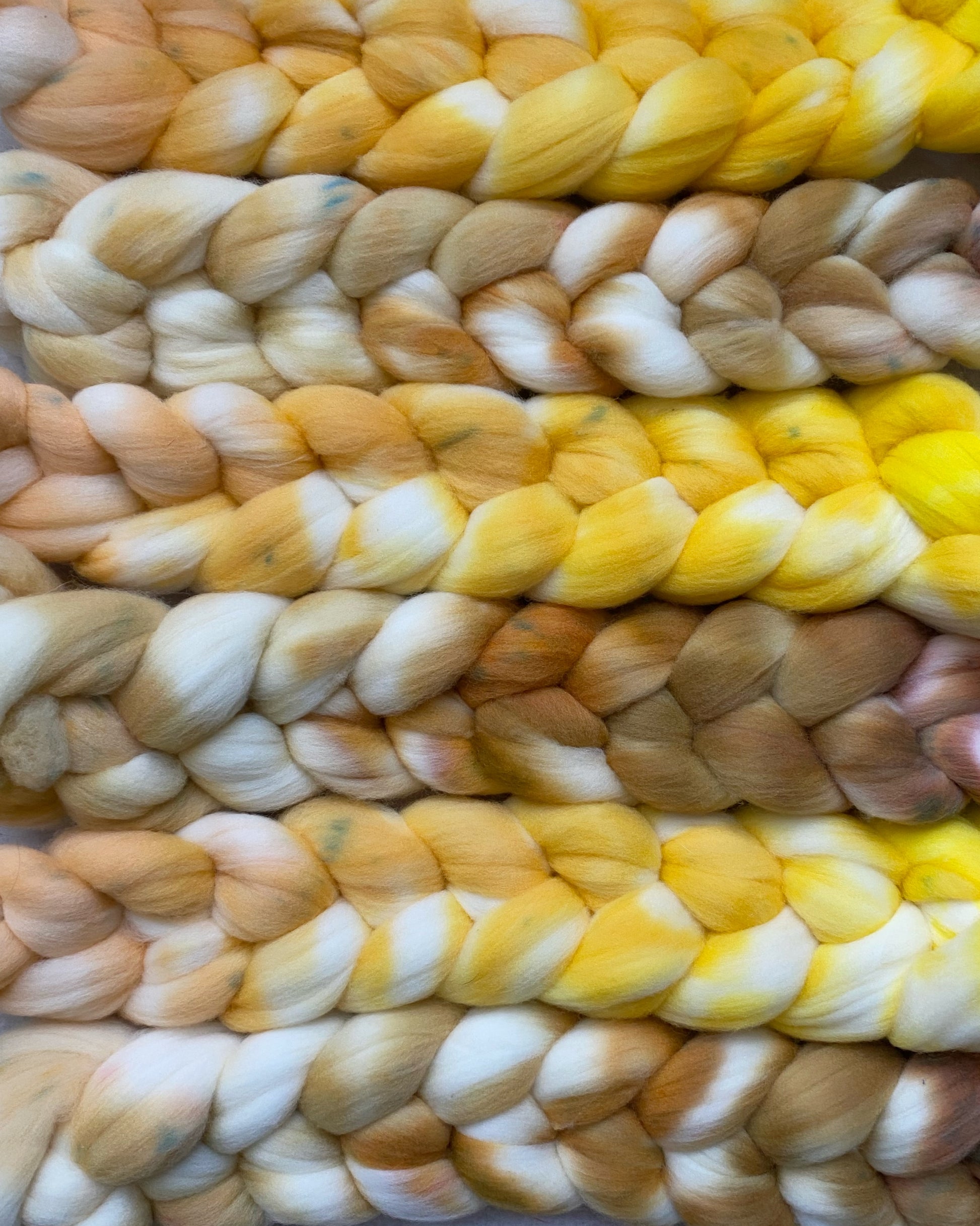 The first braid flows in a luscious golden peach to warm honey gradient, like sun-ripened fruit caramelizing under a golden glaze. The second braid layers sweet cream, toasted sugar, buttery toffee, cinnamon drizzle, and baked biscuit, mimicking the deep, golden browns of a perfectly crisp cobbler topping. Together, they create a fiber pairing that’s as comforting as the scent of baked fruit and buttery pastry wafting through the kitchen—sweet, rich, and irresistibly warm.