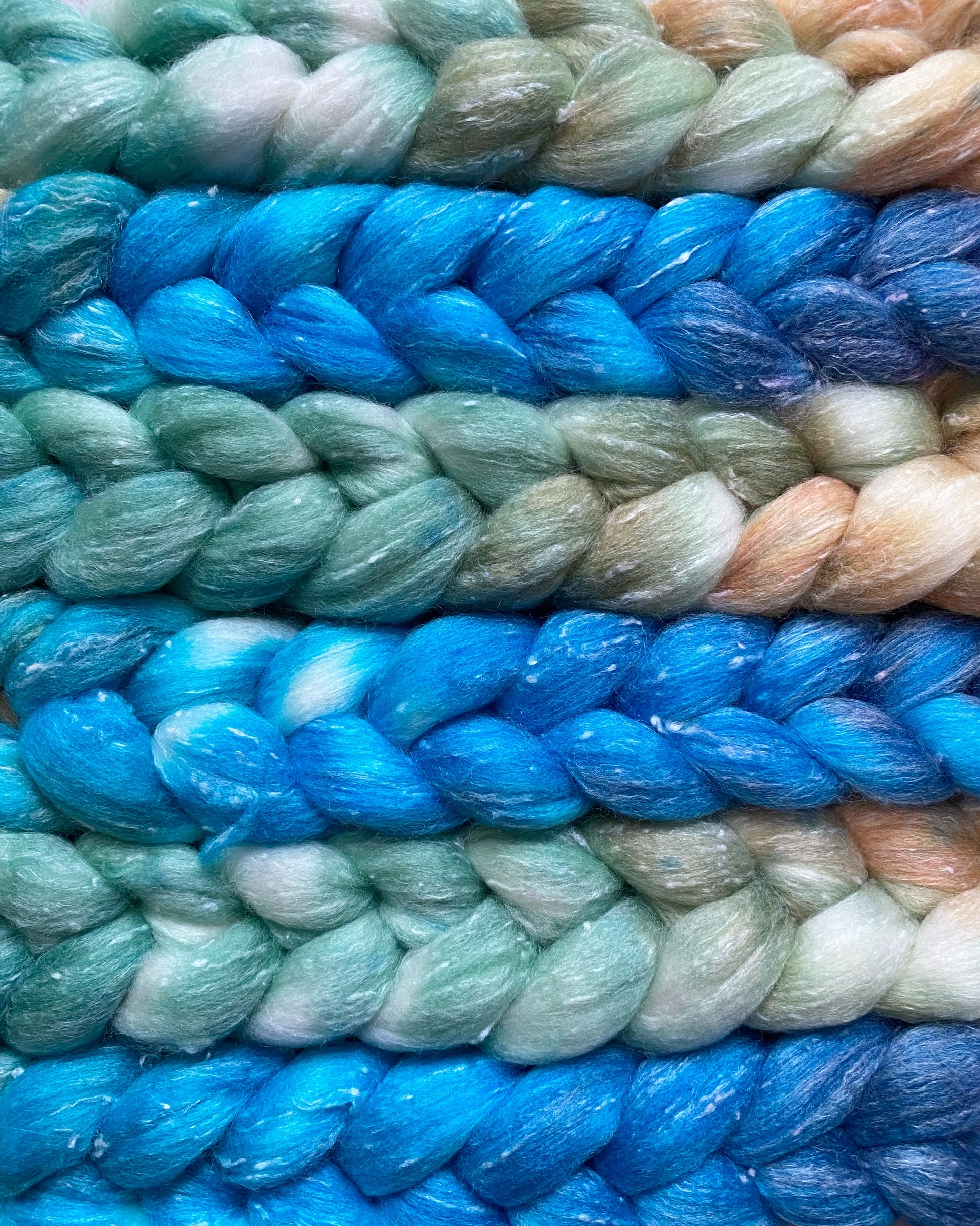 Both braids are a luxurious Merino and bamboo viscose blend, smooth as sea-polished stone. The first gradient moves from Dune Glow to Lagoon Leaf to Deep Island Grove—a lush spectrum of greens rooted in wind-kissed earth and the wild coast. The second braid begins with Sunset Shell and flows into Misty Tide, Open Sea Blue, and Ocean Deep, capturing the ever-shifting blues of water, sky, and adventure. Spun together, they create yarn that’s serene, layered, and ready to explore whatever’s waiting beyond the horizon.