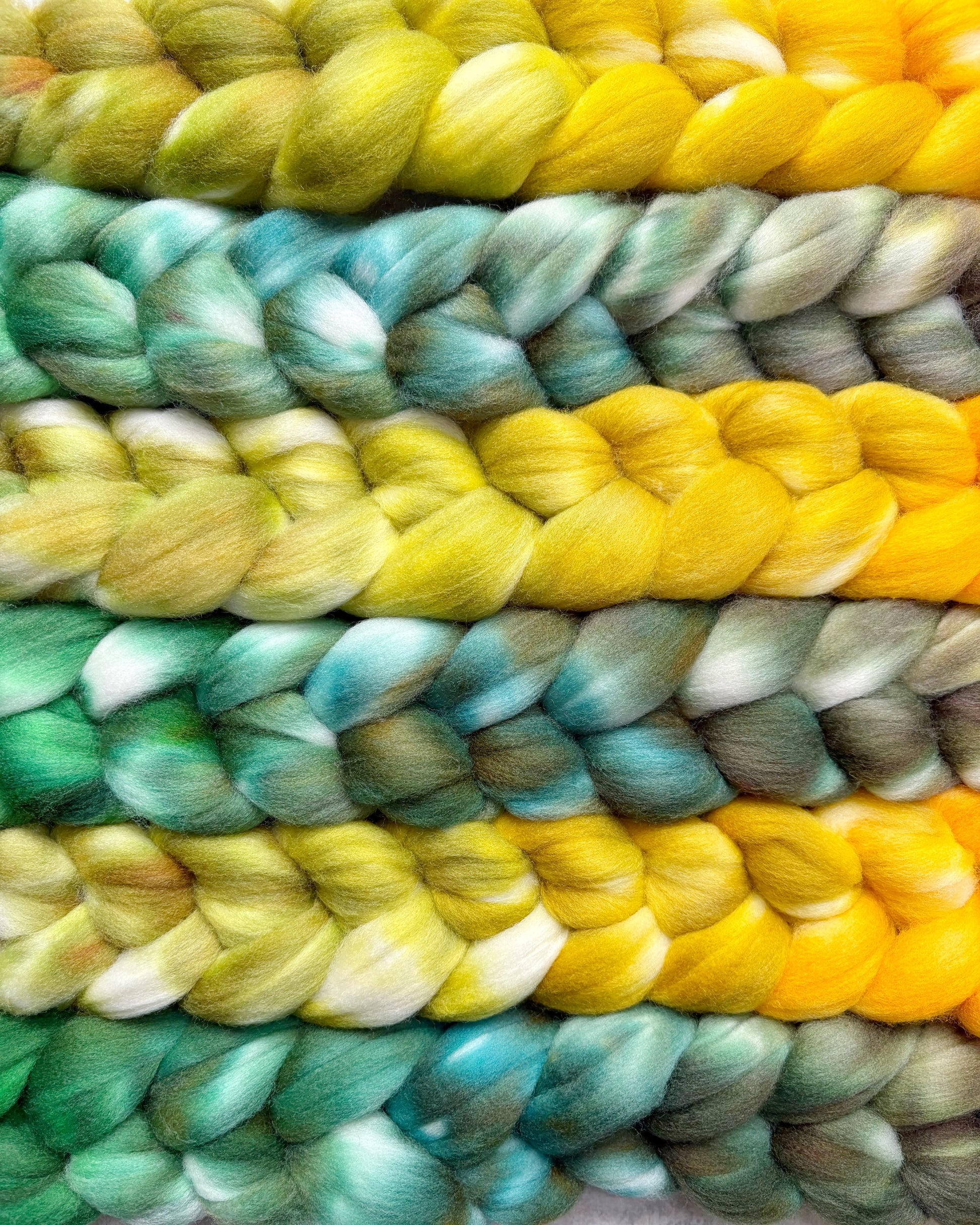 The first braid blooms in a forest-fresh gradient from Juniper Whisper to Celestial Sprout to Terran Echo—a journey from cosmic green to earth-toned resolve, mirroring Mantis’s balance of alien lightness and grounded care. The second braid glows from Solar Flare to Antenna Bloom to Empathy Root, blending warmth and growth in gold, green, and soothing tan. Together, they spin a yarn that’s luminous, layered, and gently bold—a soft shimmer of power hiding in plain sight.