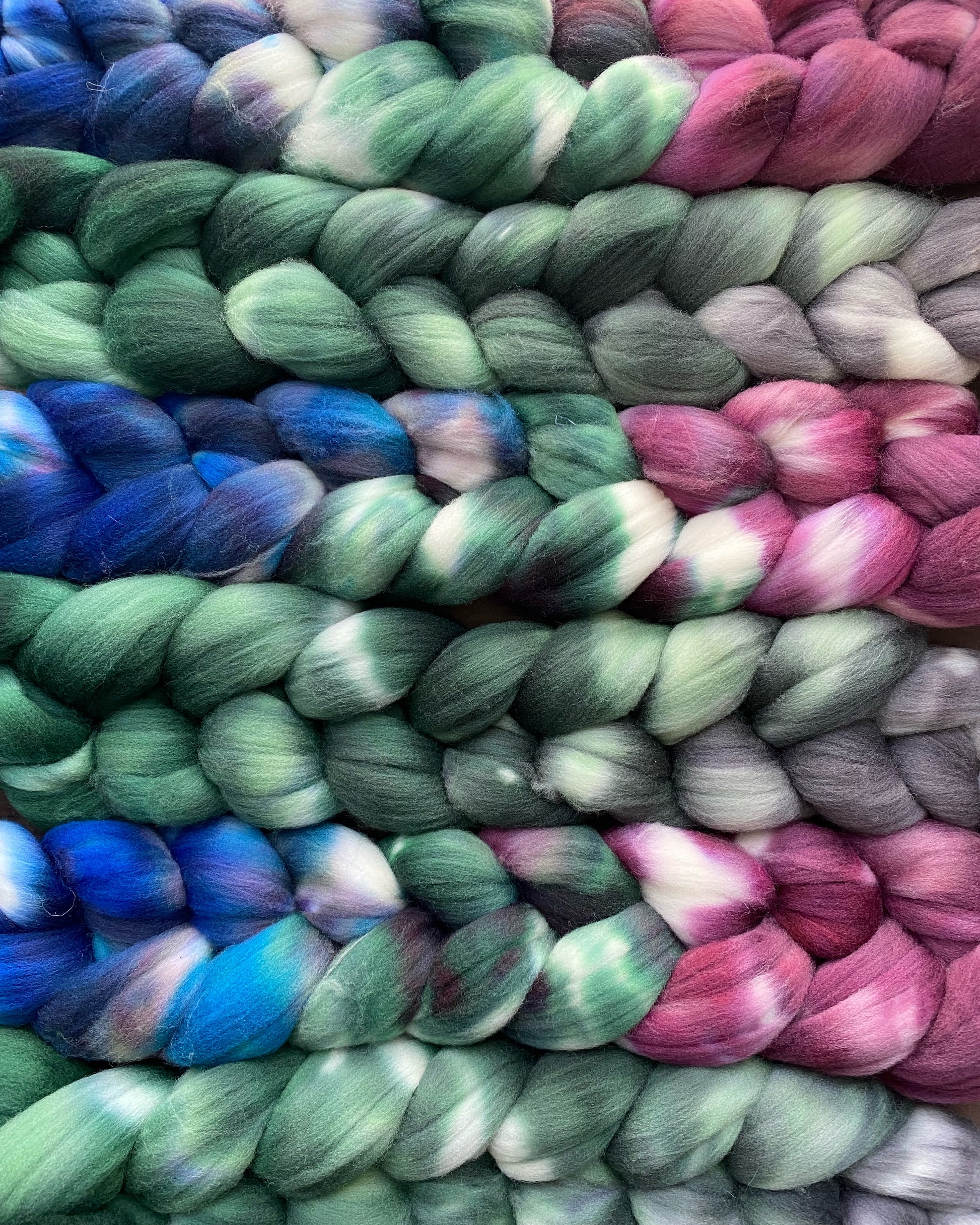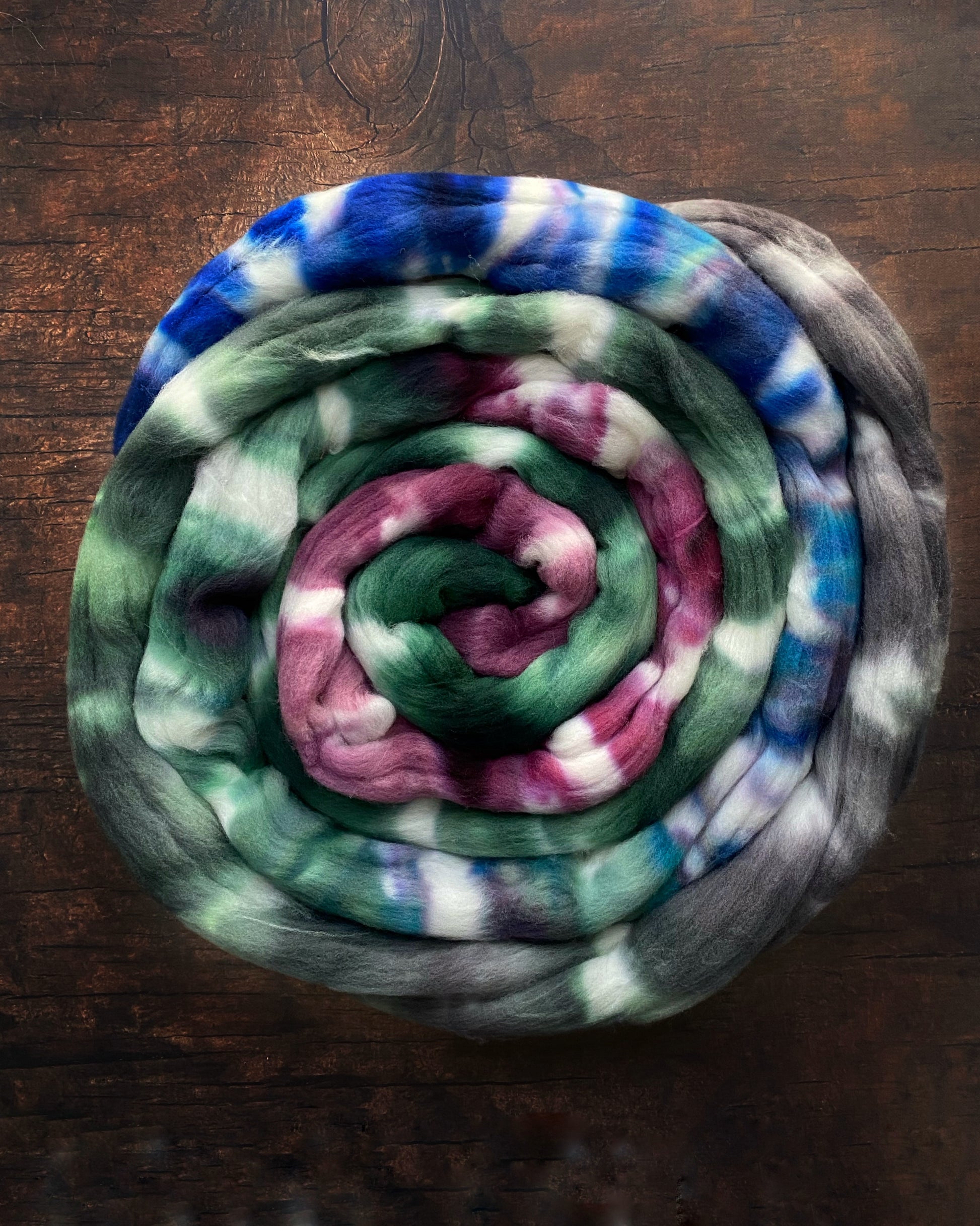 Welcome to the fiber journey of Mmrs plying pairs! Listen to your creative muse and let your fingers dance upon the wheel as you craft your own fiber symphony. One braid boasts a captivating gradient from green to grey, while the other dazzles with a medley of blues, greens, and burgundy. Made with the finest Rambouillet wool, these fibers are poised to ignite your spinning inspiration.