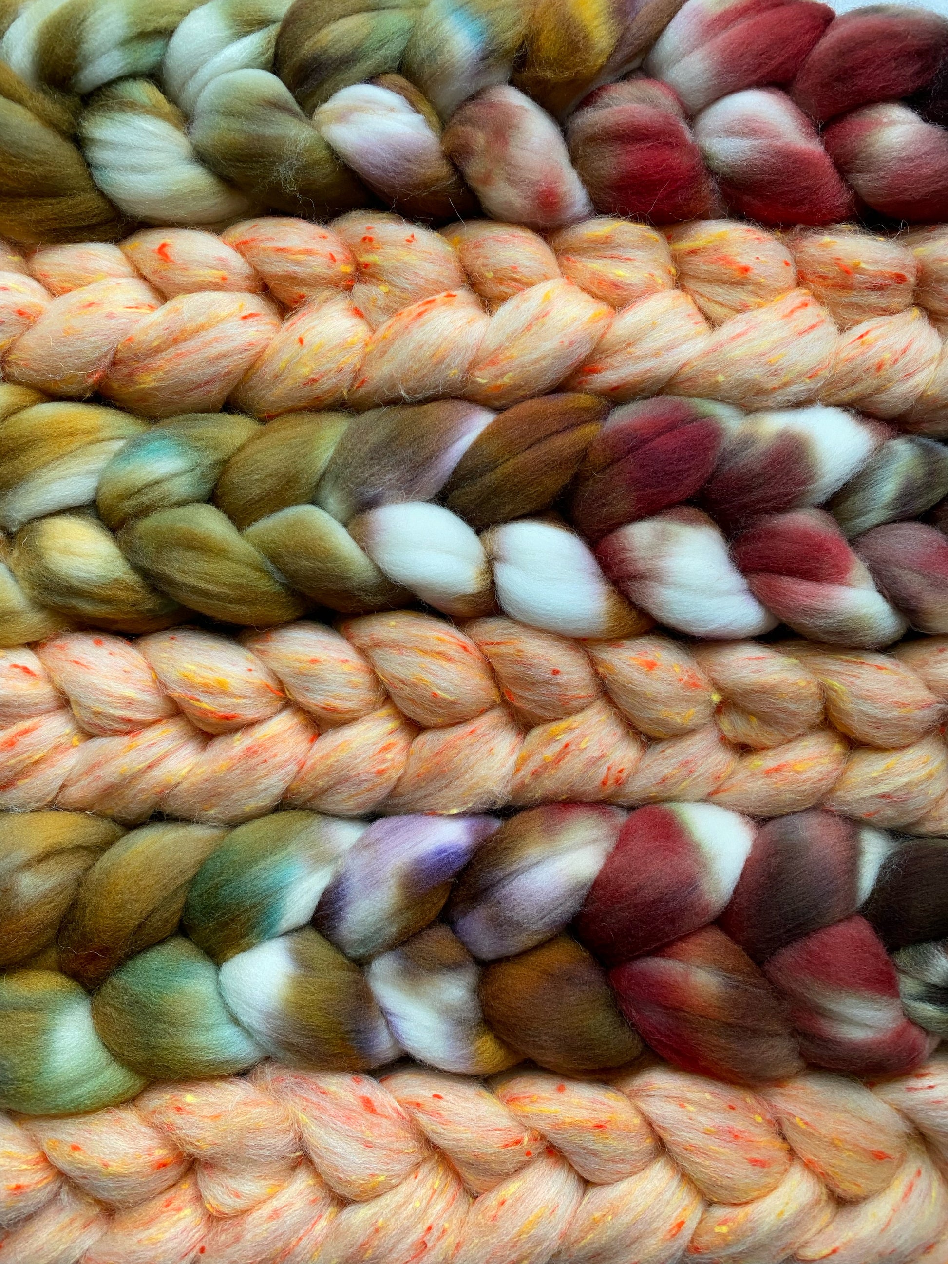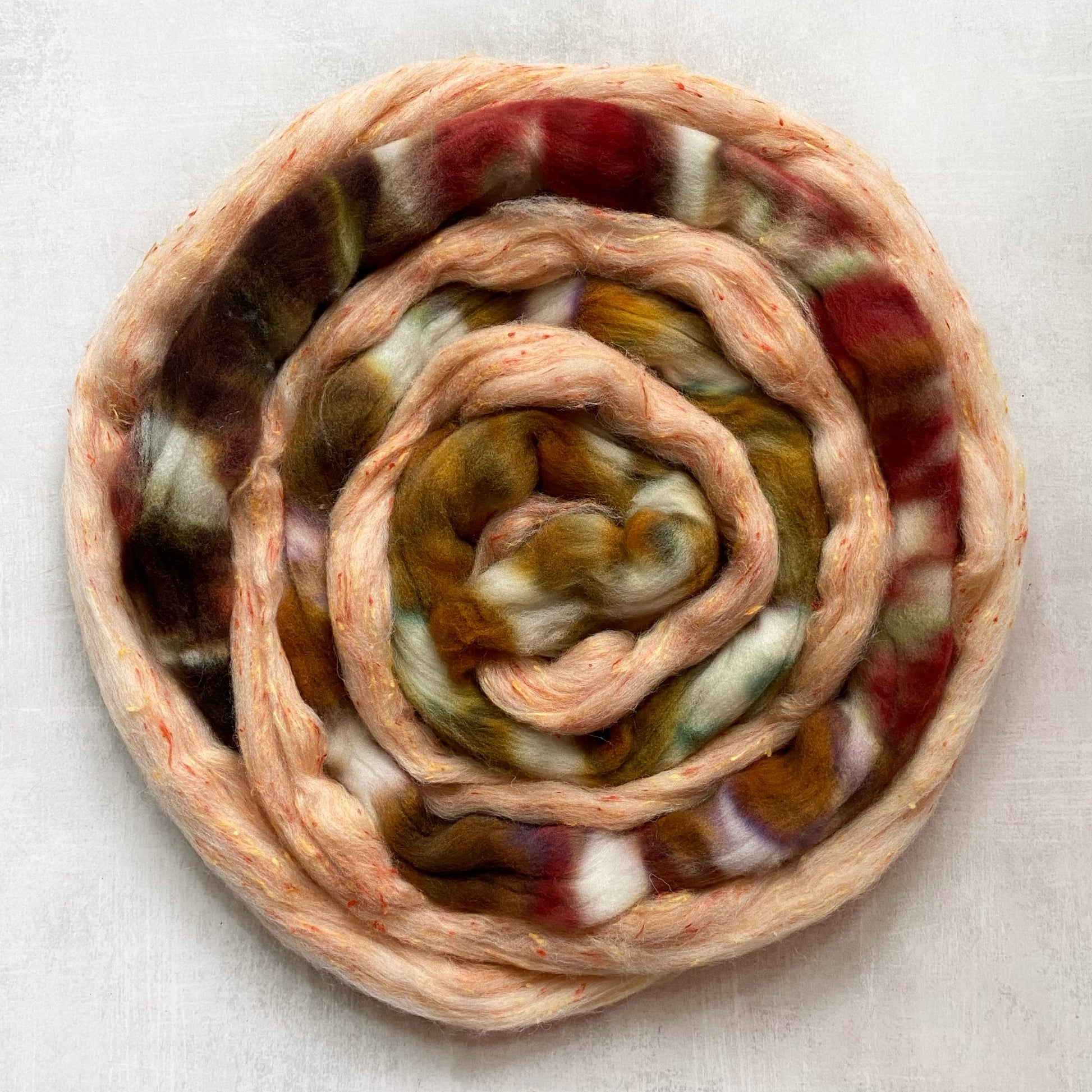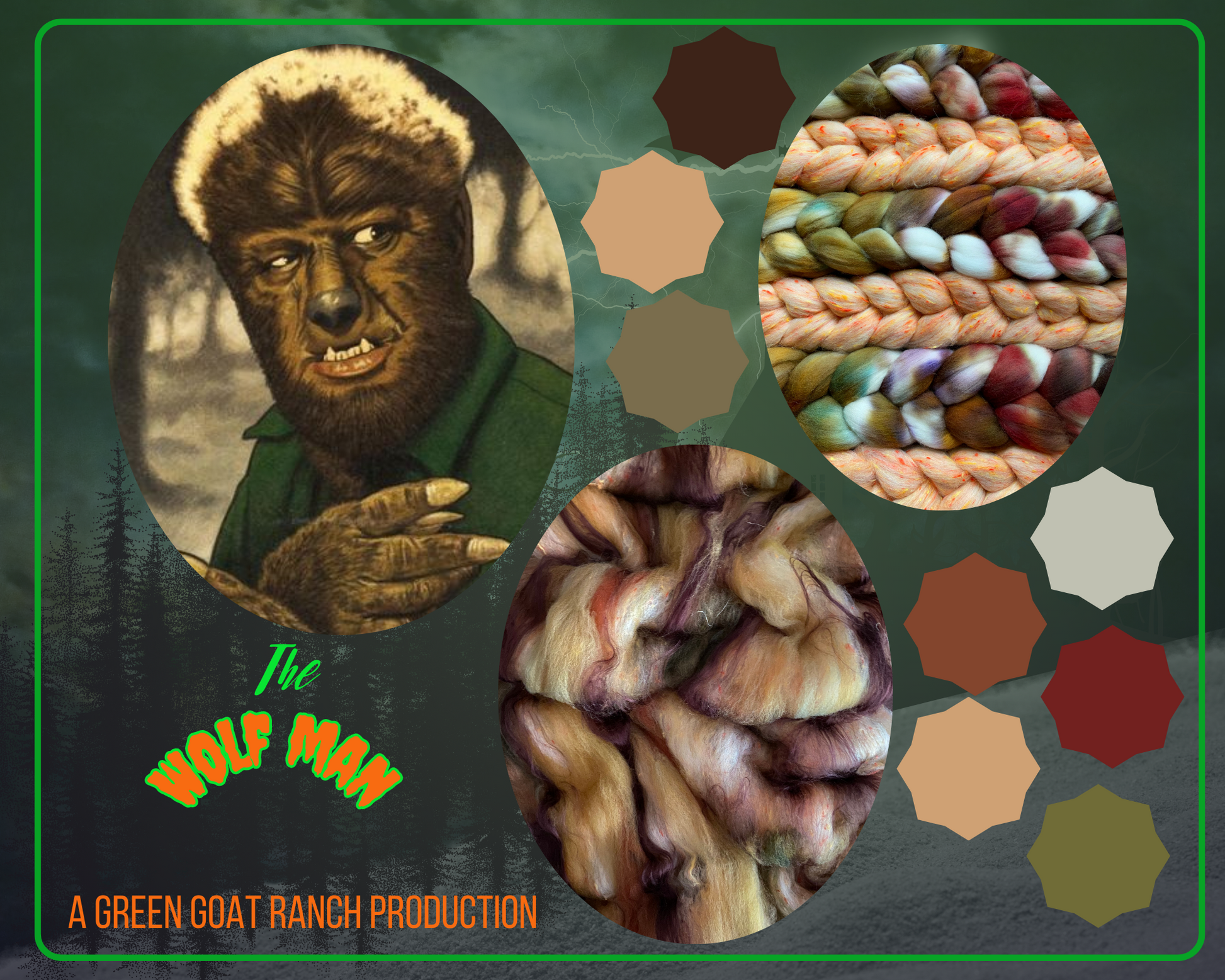 On nights when the moon rises full and fierce, something wild stirs in the shadows. The Wolf Man plying pair captures this primal energy with an orange tweed braid, blazing like the fiery glow of the harvest moon, paired with the rich browns of Rambouillet, as deep and earthy as the forest floor. Spin this yarn and feel the pull of the untamed, the call of the night, and the transformation from man to myth. With every twist, release the beast within and craft a story of instinct, survival, and the howl that echoes through the woods.
