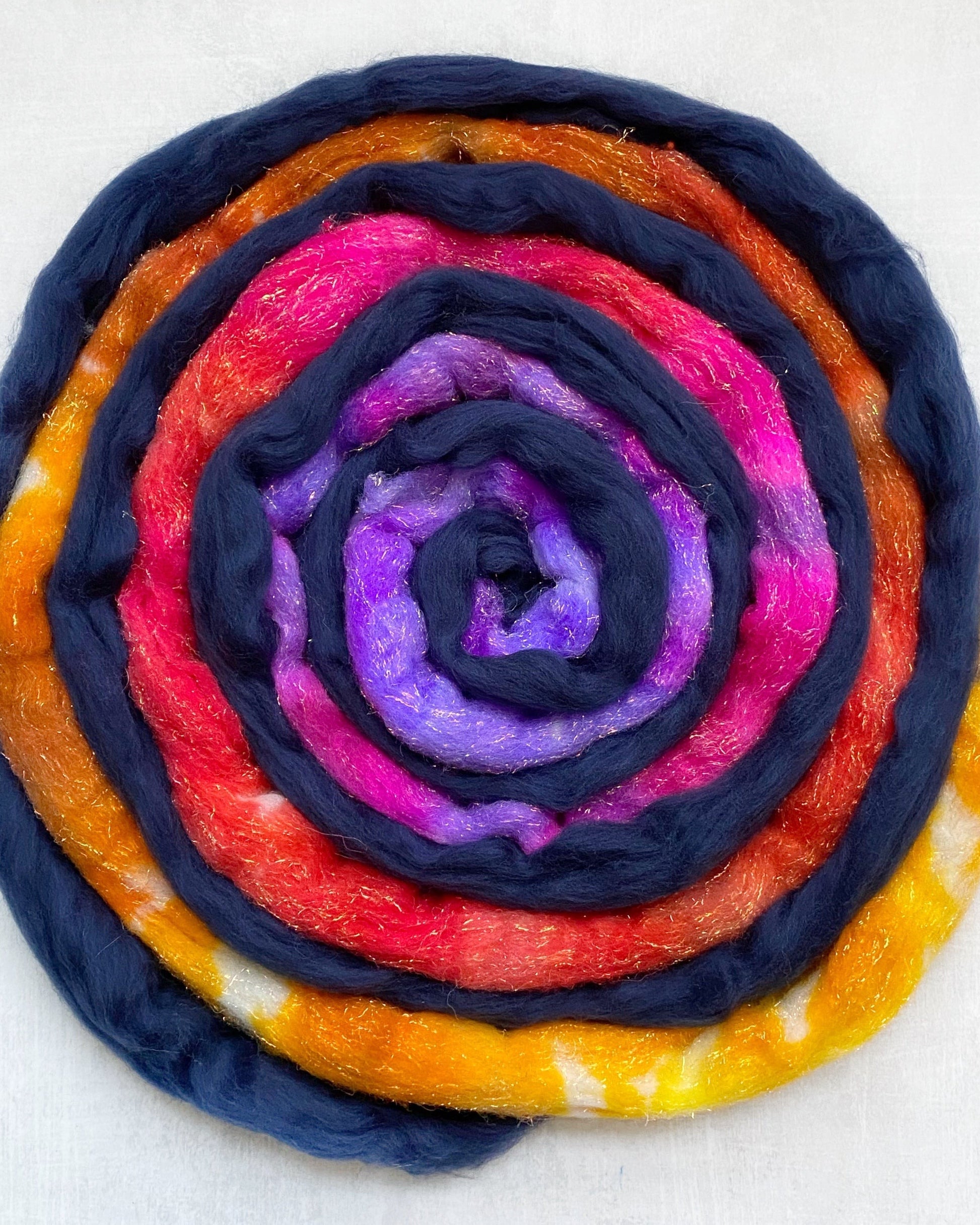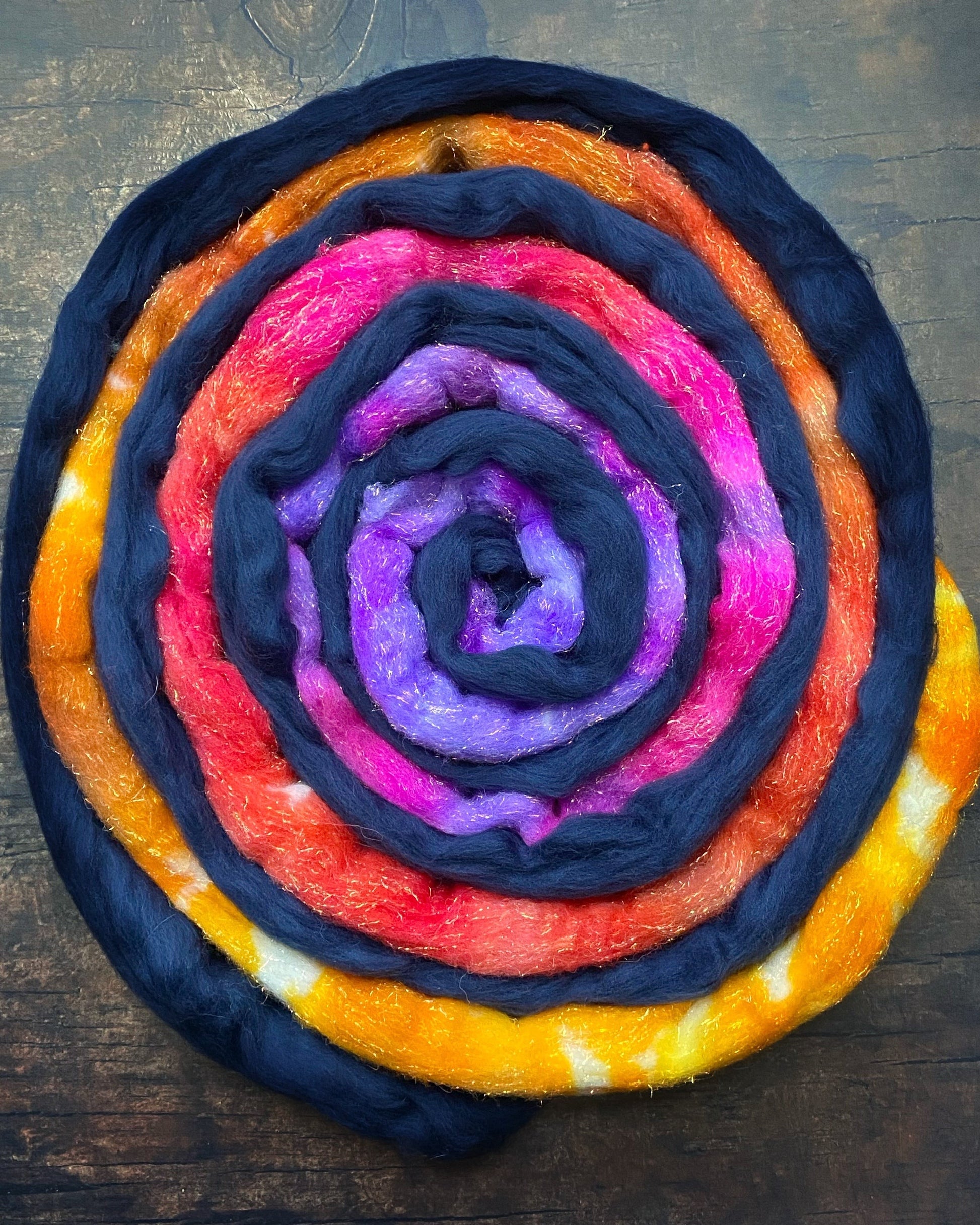 Inspired by the necromantic spell Feign Death, this plying pair from the Spell Components Collection offers a rich, mysterious blend of color and texture that’s perfect for spinners who love deep, dramatic contrasts. This set includes one braid of midnight solid merino wool and one braid of merino wool and sparkle, featuring an enchanting mix of purple, pink, and orange. Like the spell, this plying pair brings a subtle magic to your spinning, transforming the ordinary into something both hidden and powerful.
