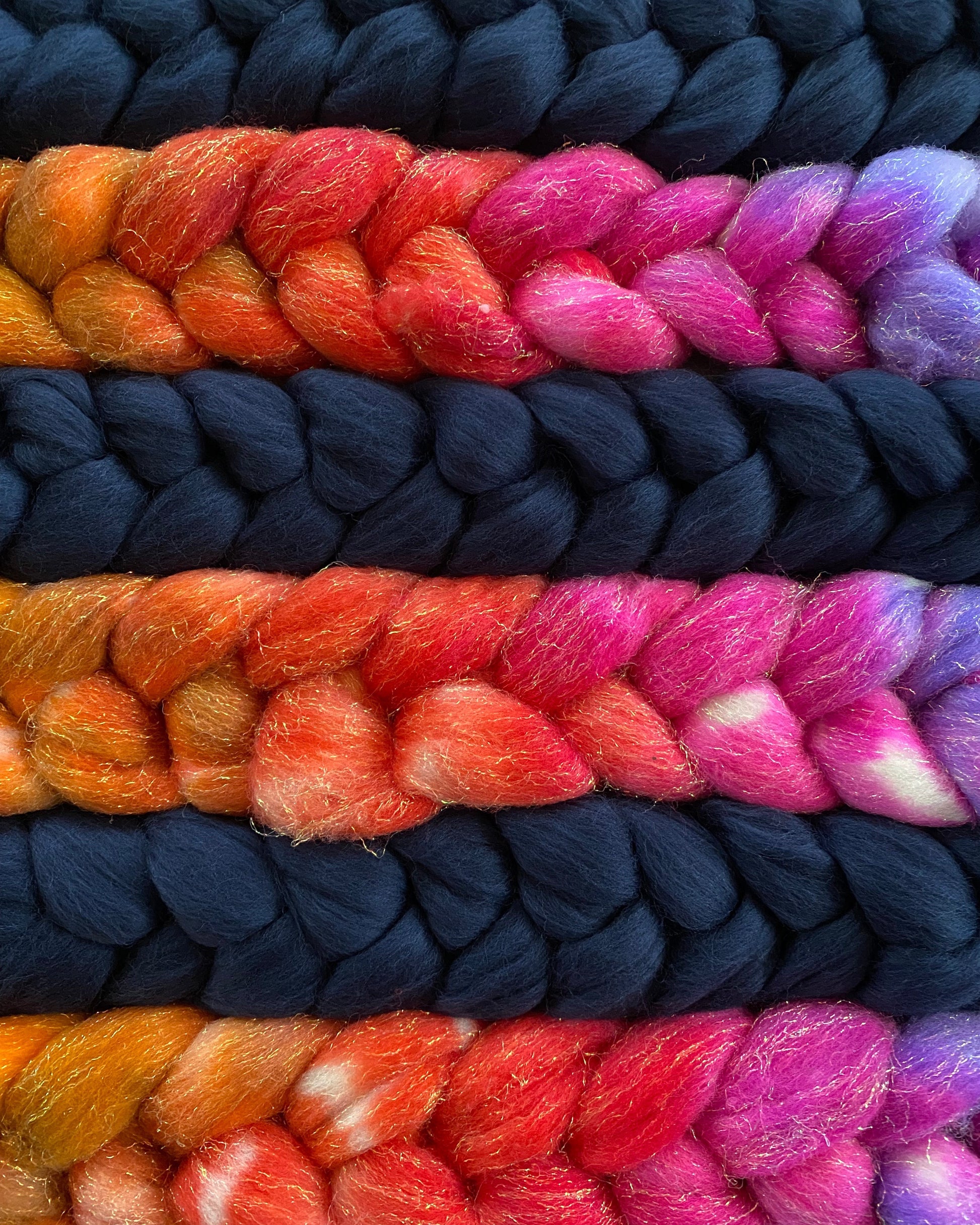 The solid midnight braid represents the quiet stillness of the spell—deep, shadowy, and full of potential. Paired with the multi-colored sparkle braid, which shimmers with vibrant purples, rich pinks, and fiery oranges, this combination creates a dynamic contrast. As the colors twist together, the yarn reveals a hidden complexity, just as the Feign Death spell hides life beneath the surface.