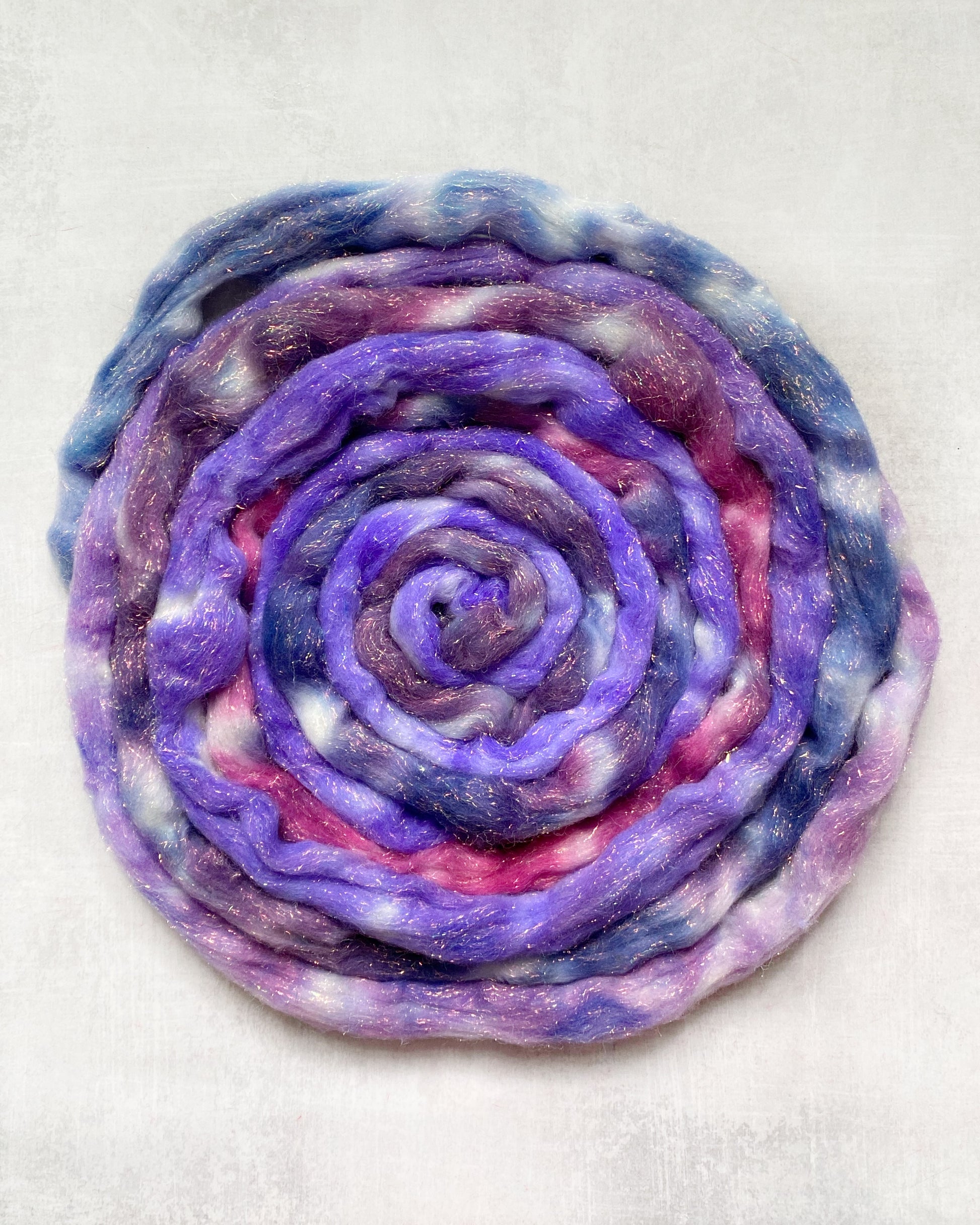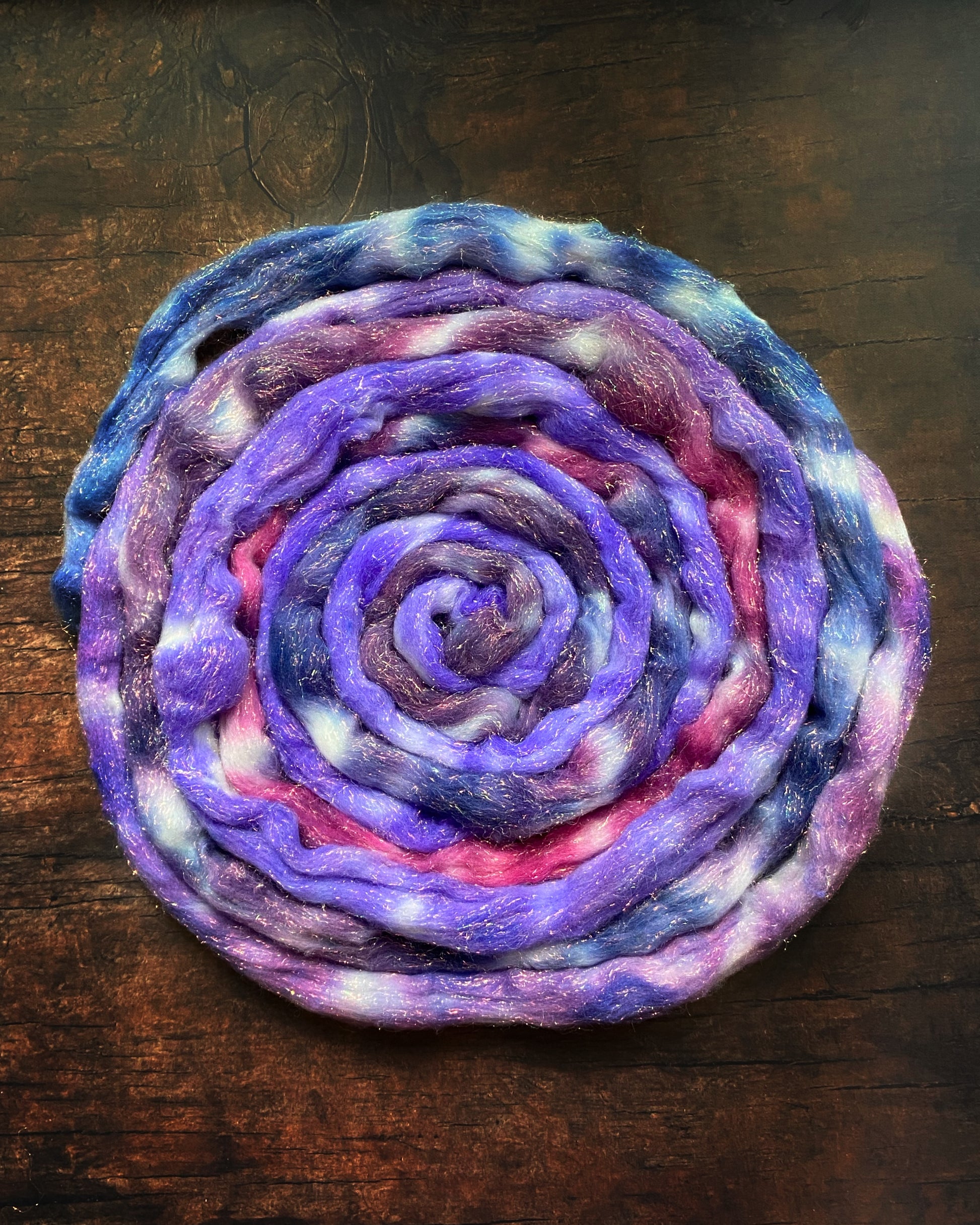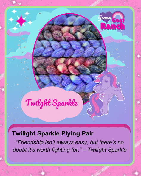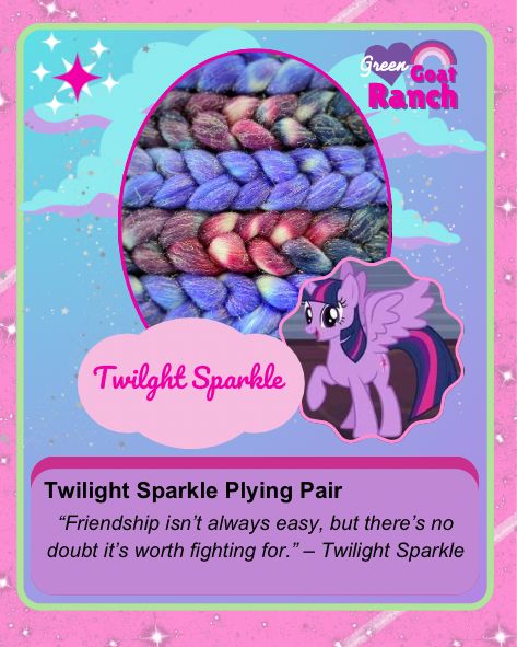 Her plying pair shimmers with a deep purple gradient, symbolizing the mysteries of the universe and the wisdom she holds. Paired with a rich pink-and-deep-purple multi, this fiber celebrates the blend of logic and magic, precision and creativity. Spin something that shines as brightly as Twilight’s magic!