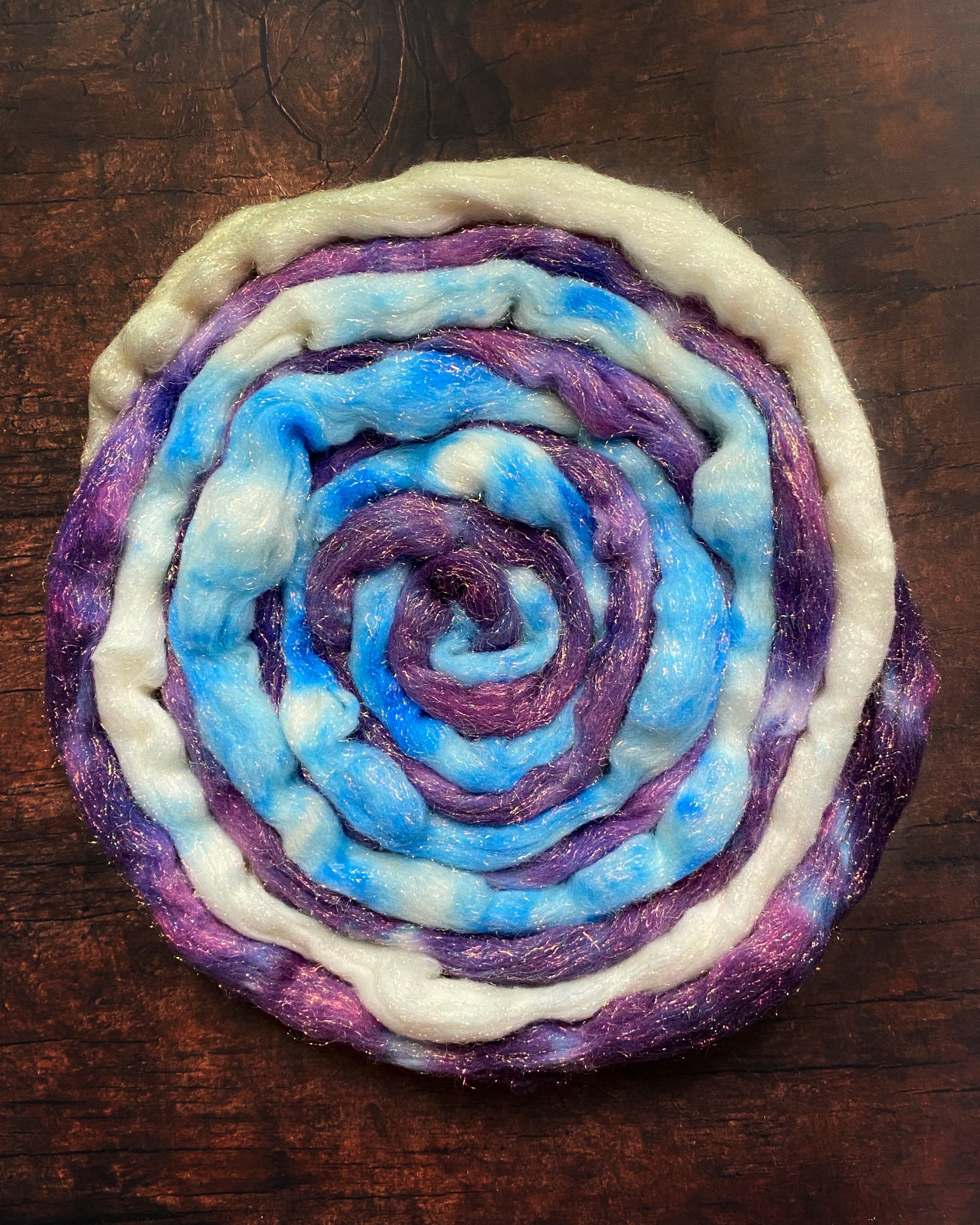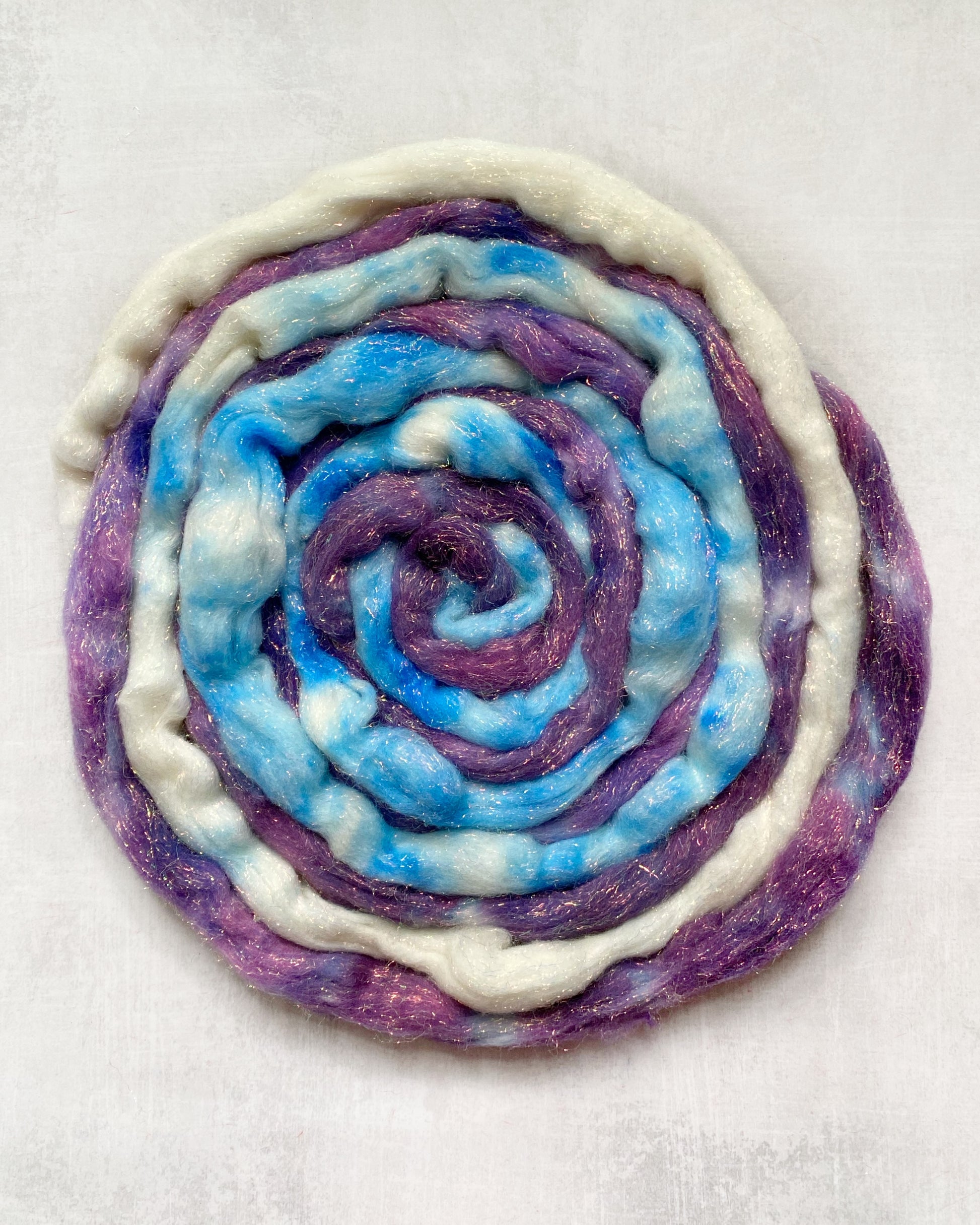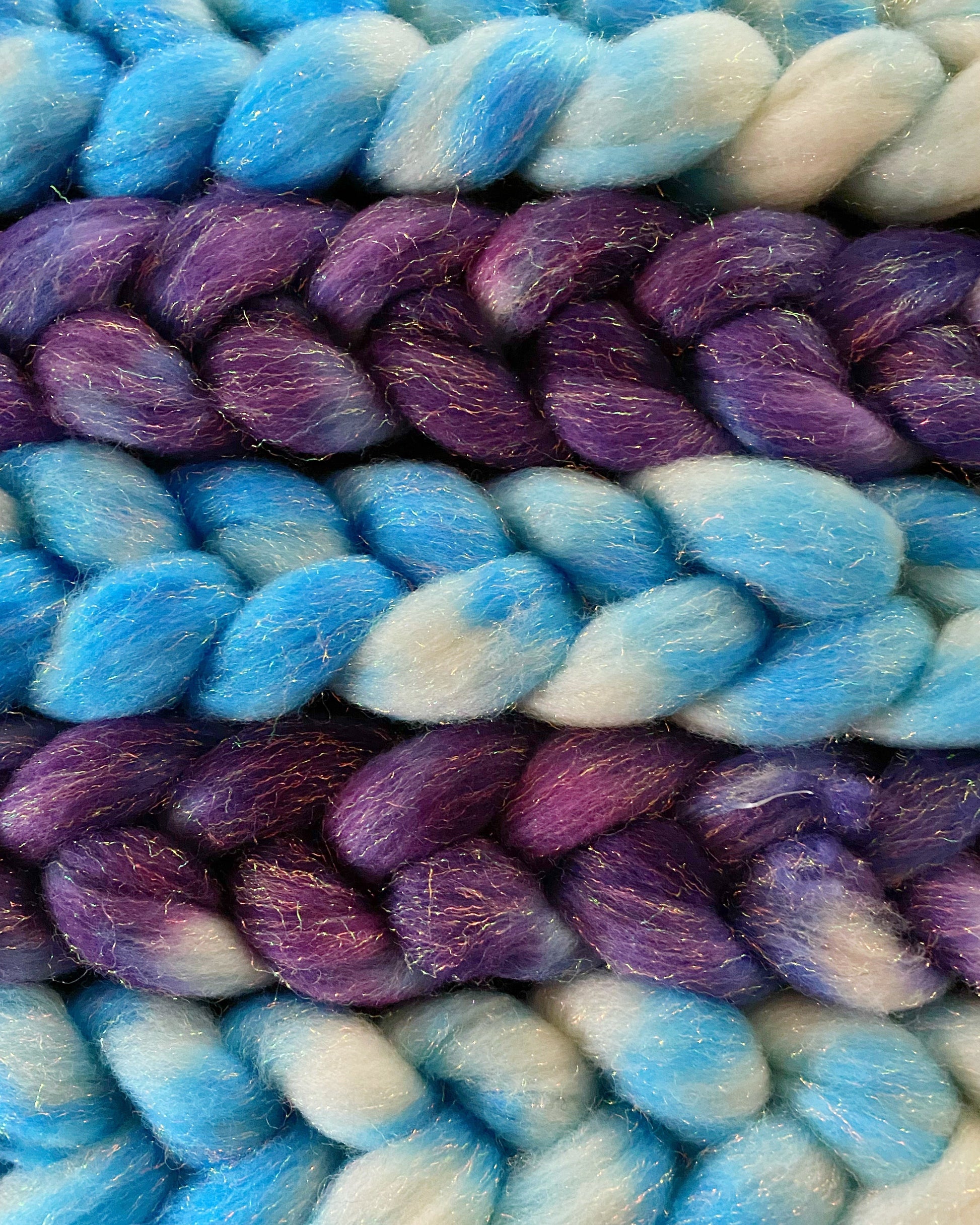 Her plying pair features a sky blue-to-white gradient, as crisp and dreamy as a winter morning. The soft purple gradient in the multi mirrors her signature curls and luxurious aesthetic. Spin the fiber equivalent of haute couture, where every stitch is a masterpiece.