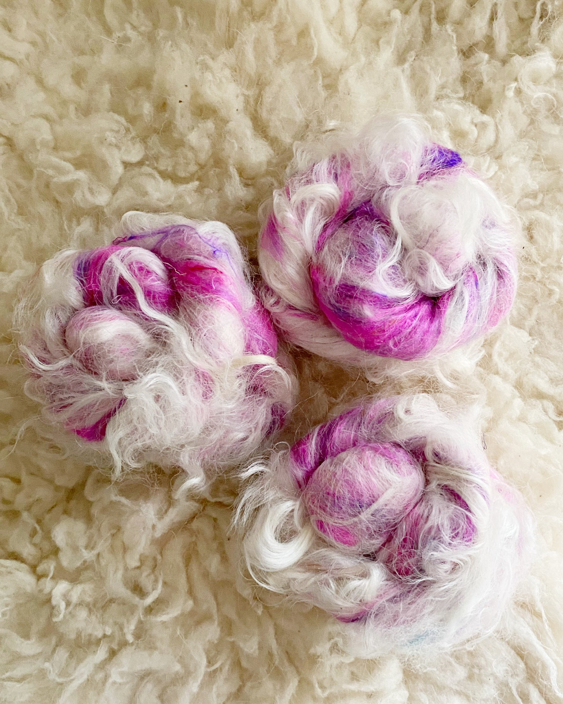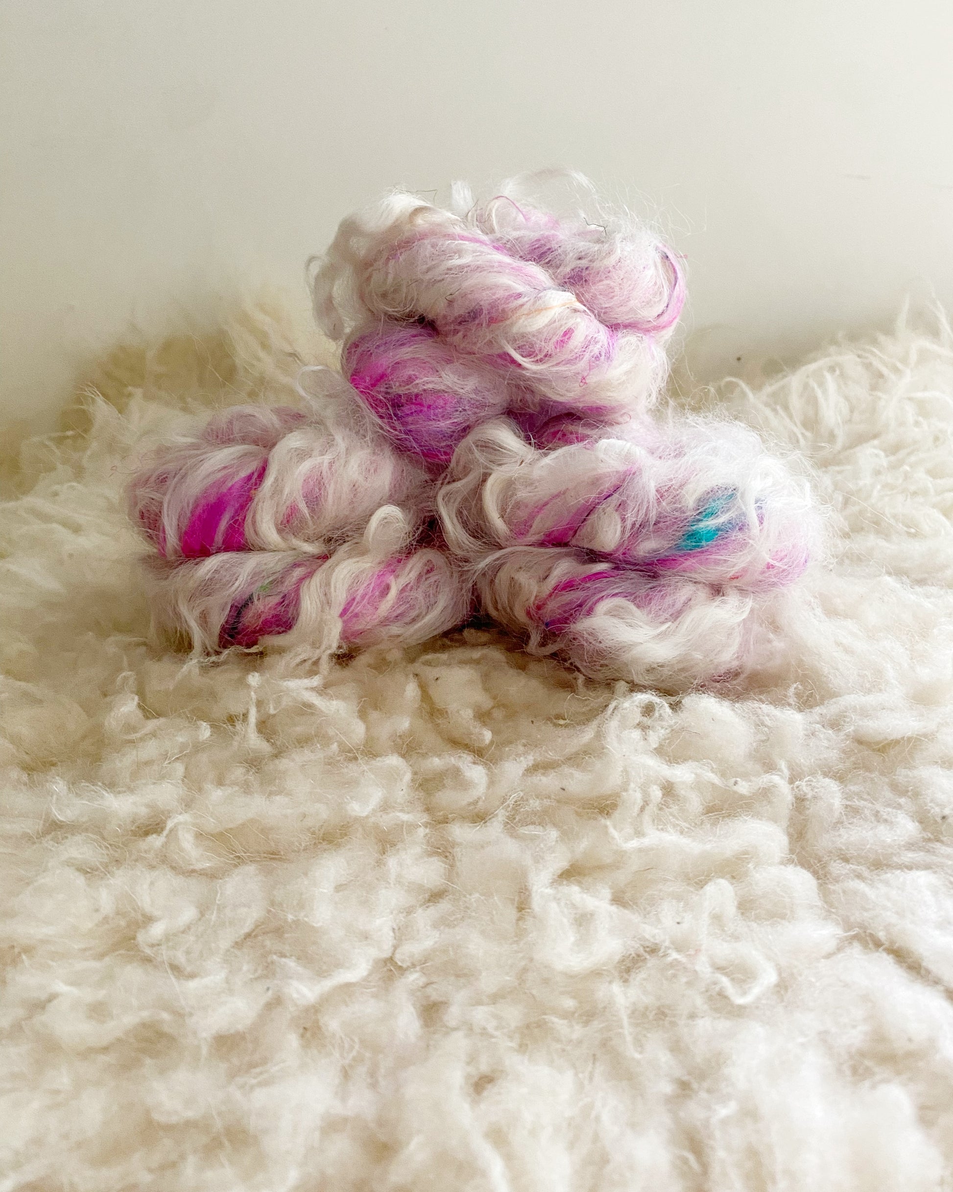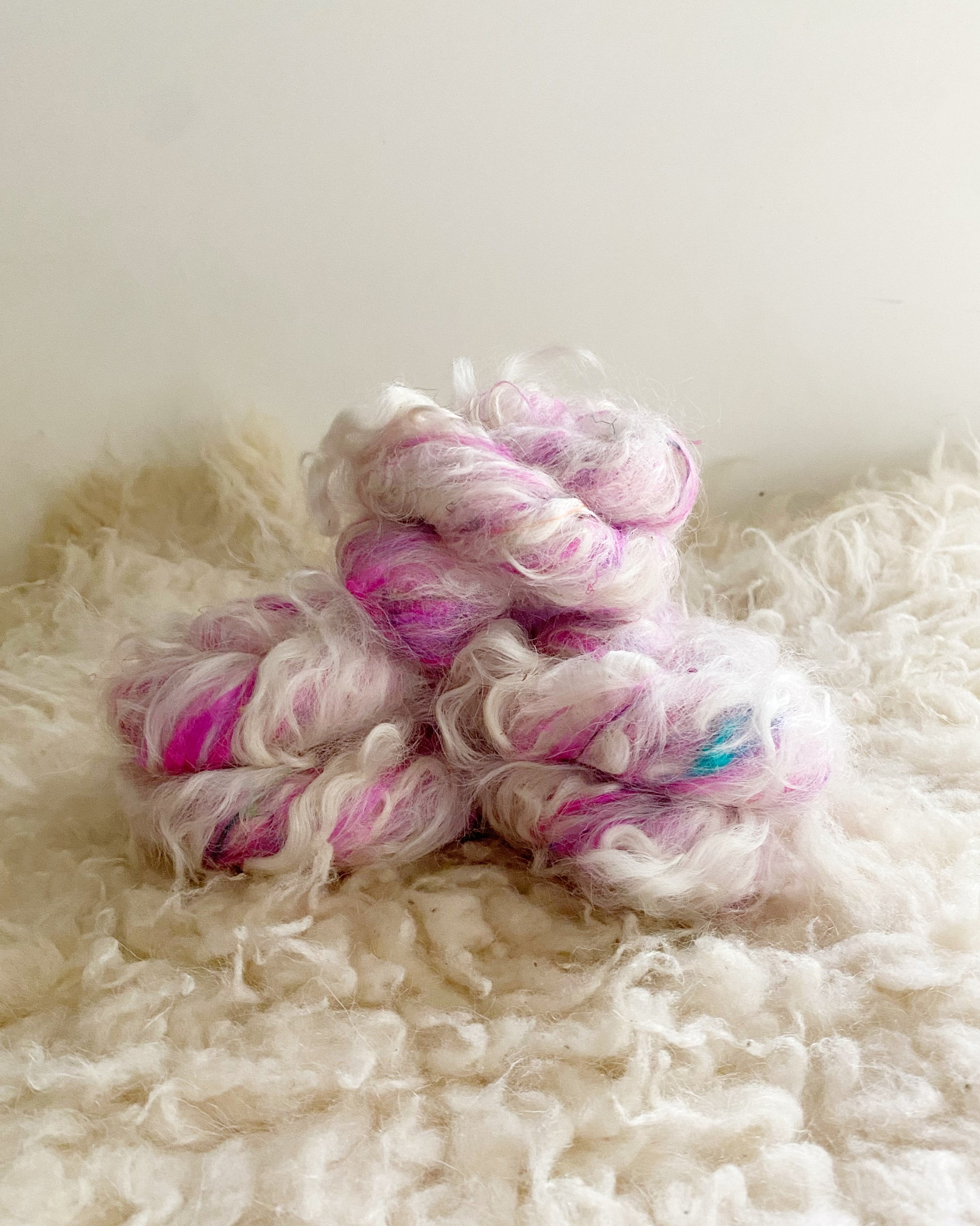 Add a touch of effervescence to your fiber adventures with Fizzbottle, a textured battling that combines the radiant shine of white Lincoln wool with playful hints of pink sari silk. Known for its long, silky locks and distinctive luster, Lincoln wool brings a luxurious texture to your spinning or felting projects. The clean, snowy white base shimmers like bubbles in a glass, while the vibrant pink sari silk adds a pop of fizzing color, reminiscent of a celebratory toast. It’s a fiber cocktail that’s equal parts elegance and whimsy.