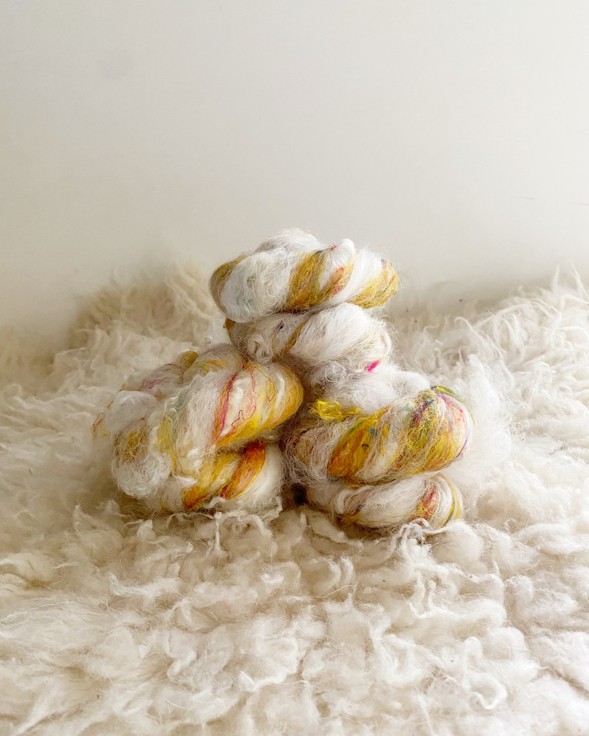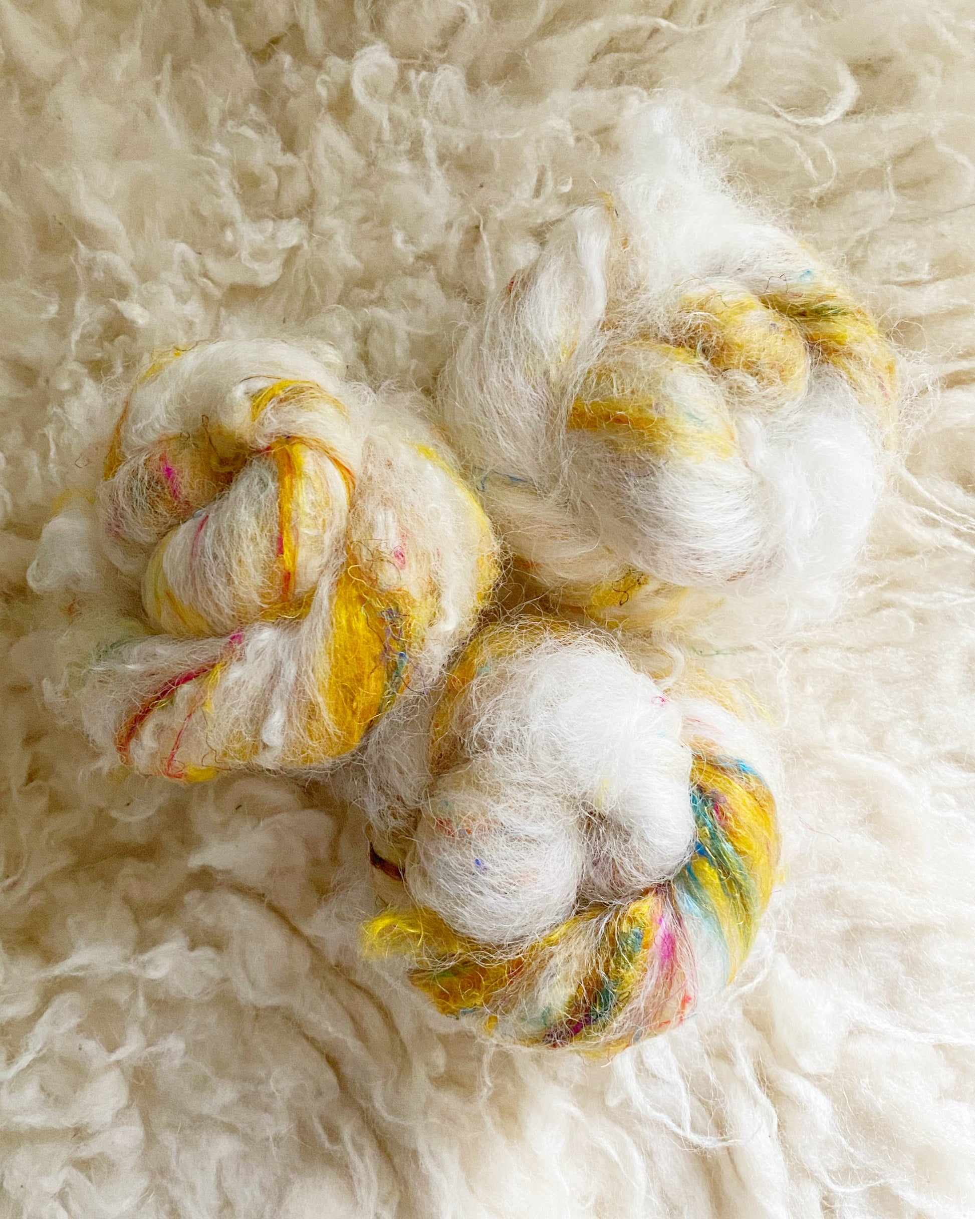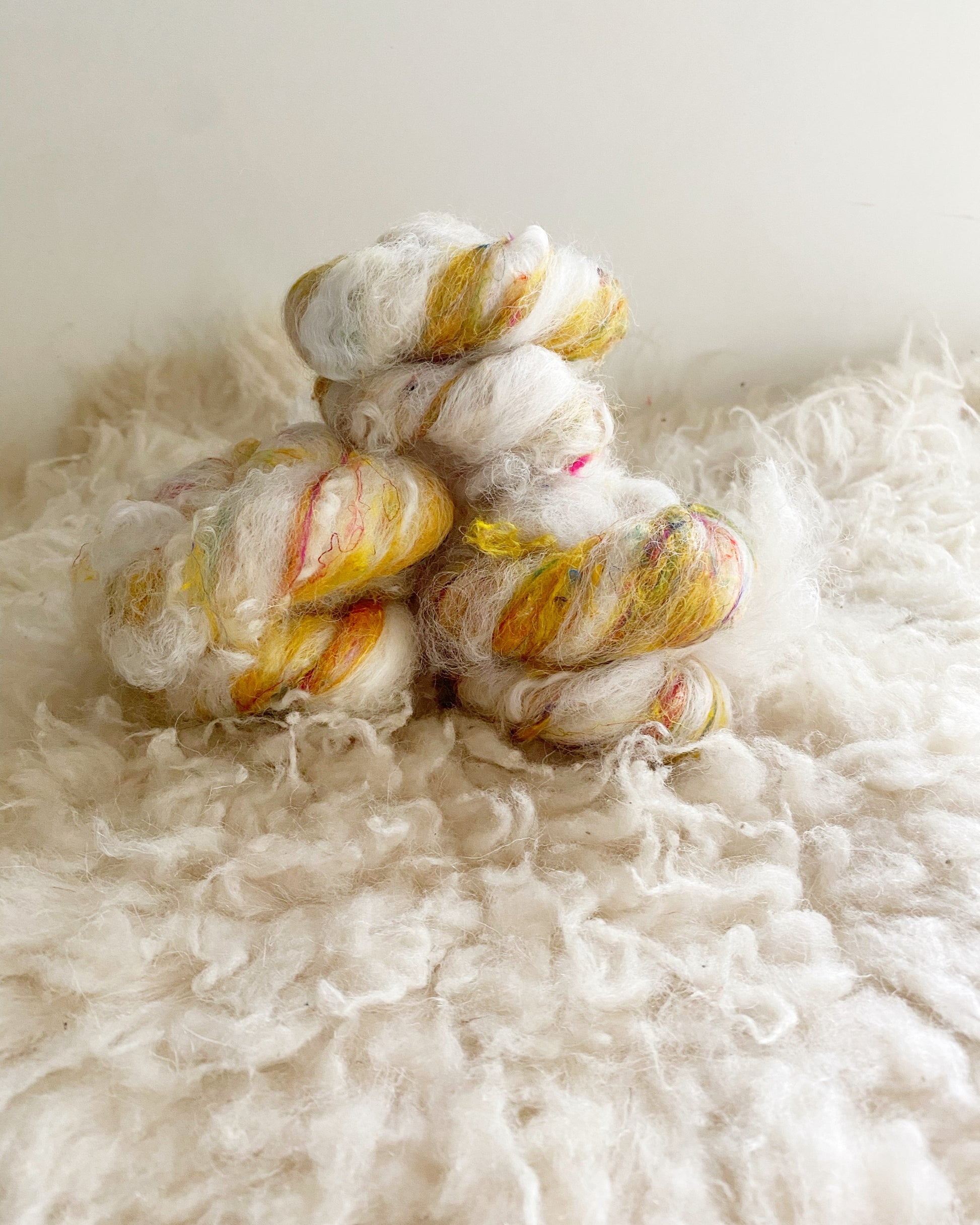 Loosely carded to preserve the wool’s natural texture, Honeywick is perfect for creating yarns that shimmer with life and warmth. Every twist brings out the silk’s radiant highlights, creating a delightful interplay of color and texture that feels as sweet as its name. Whether spinning or felting, this battling will fill your projects with a cheerful glow, making every creation a little brighter and more magical. Let Honeywick inspire you to craft with the warmth of sunshine and the sweetness of golden honey.