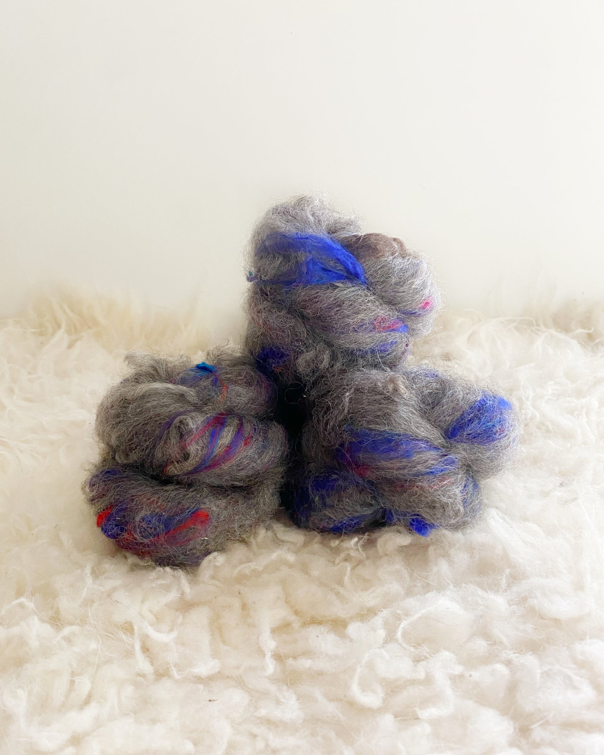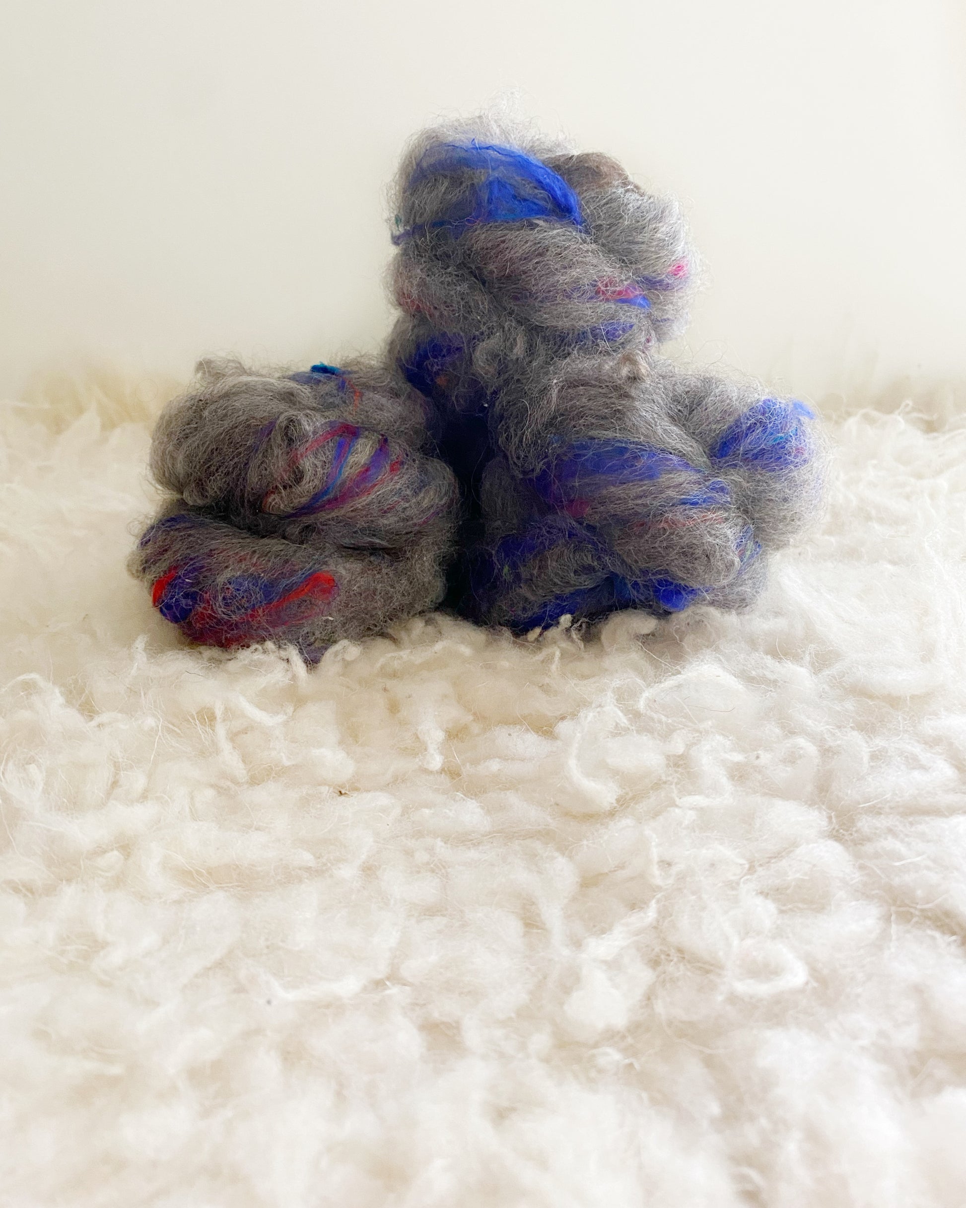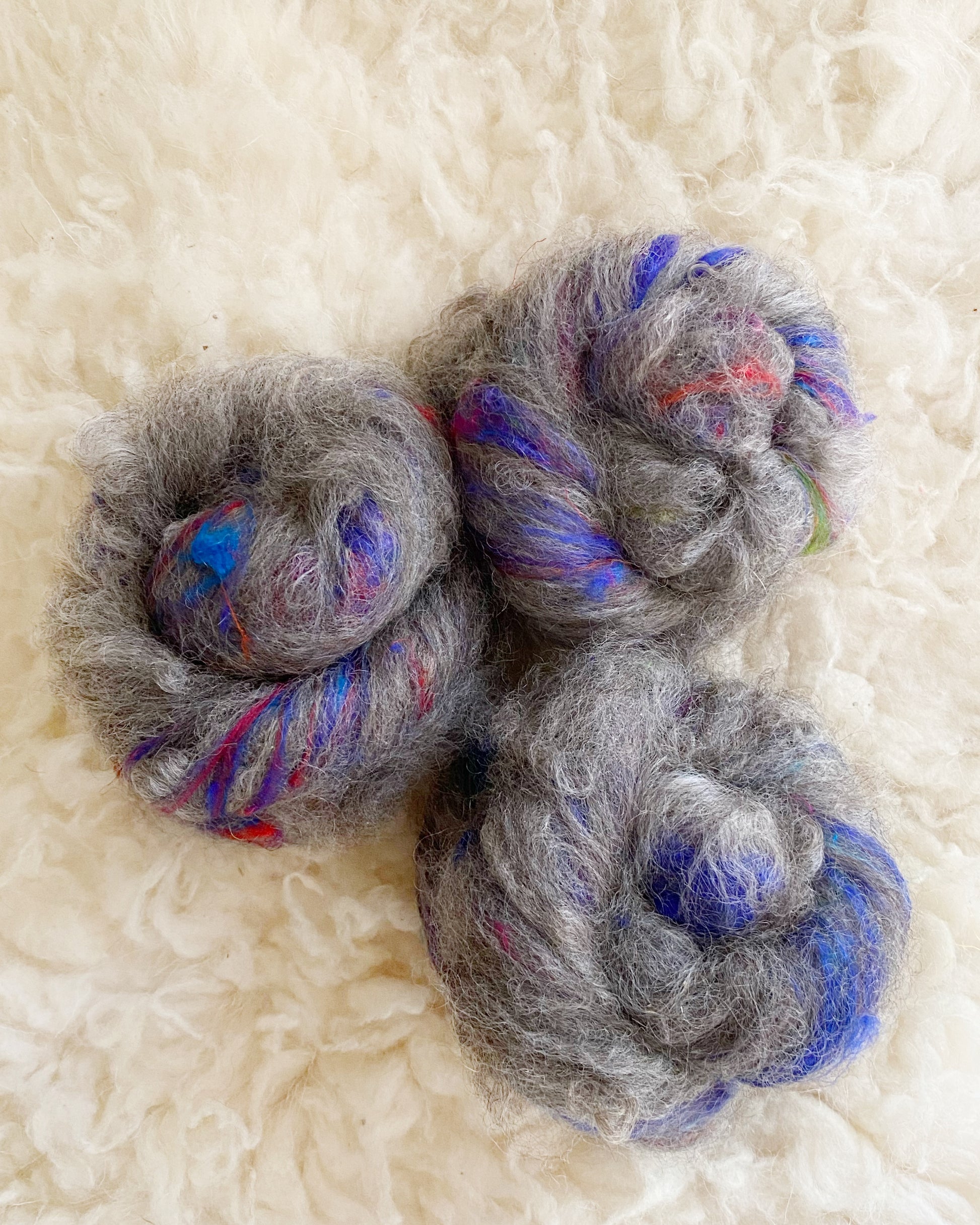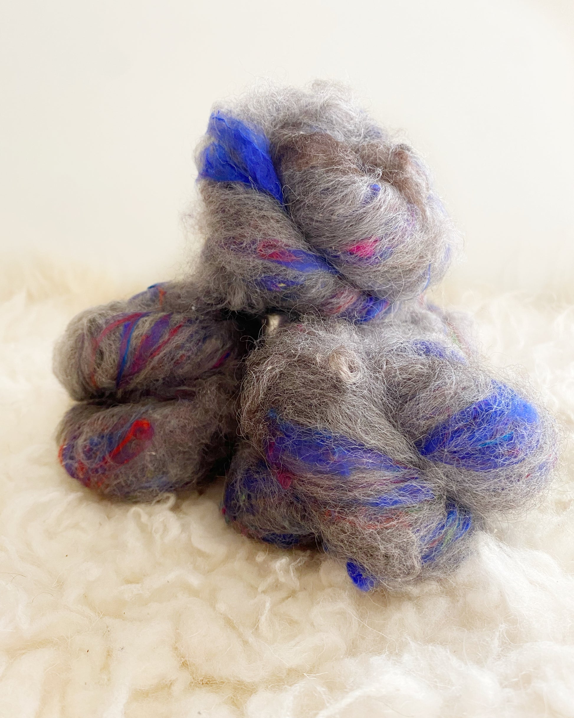 Loosely carded to highlight its natural texture, Pebblebrook is perfect for creating yarns with depth and character or adding texture to felting projects. Every turn of the fiber reveals a harmonious interplay of earthy grey and vibrant blue, sparking creativity with each twist. Whether spinning or felting, Pebblebrook brings the serene energy of a quiet stream to your hands, inspiring projects filled with calm beauty and endless possibility. Let this battling guide your craft, where every fiber flows like water over stones.