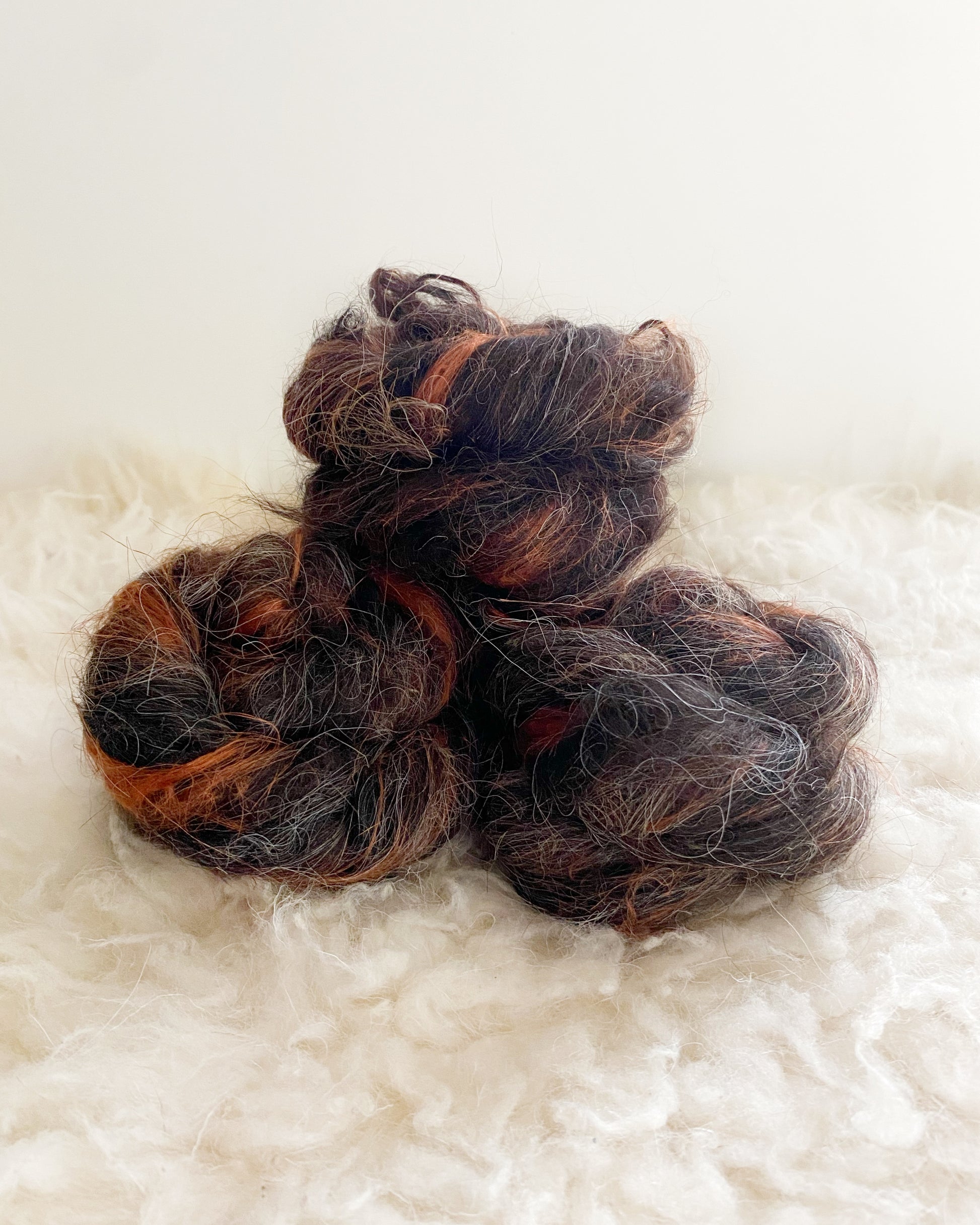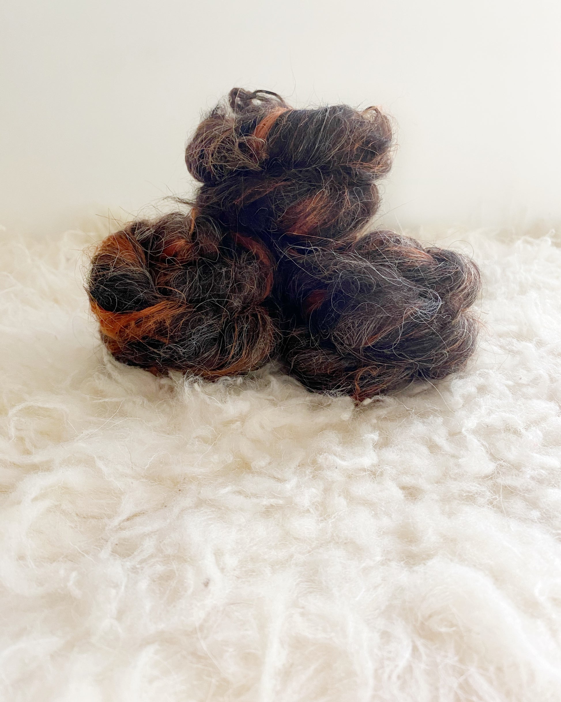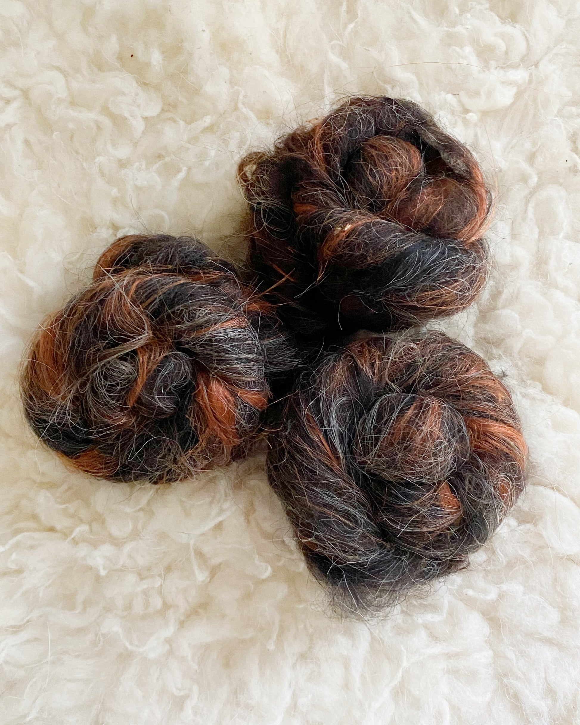 Step into an enchanted forest with Shroomwort, a textured battling that blends the rustic charm of brown Navajo Churro wool with the warm, golden hues of nutmeg flax. Navajo Churro wool, known for its strength and rich heritage, offers a textured, earthy feel that adds depth and character to your spinning or felting projects. The deep brown tones of the wool evoke the rich soil and hidden fungi of a mystical forest floor, while the nutmeg flax weaves through like tiny spores catching the light, infusing your fiber with warmth and subtle shimmer.