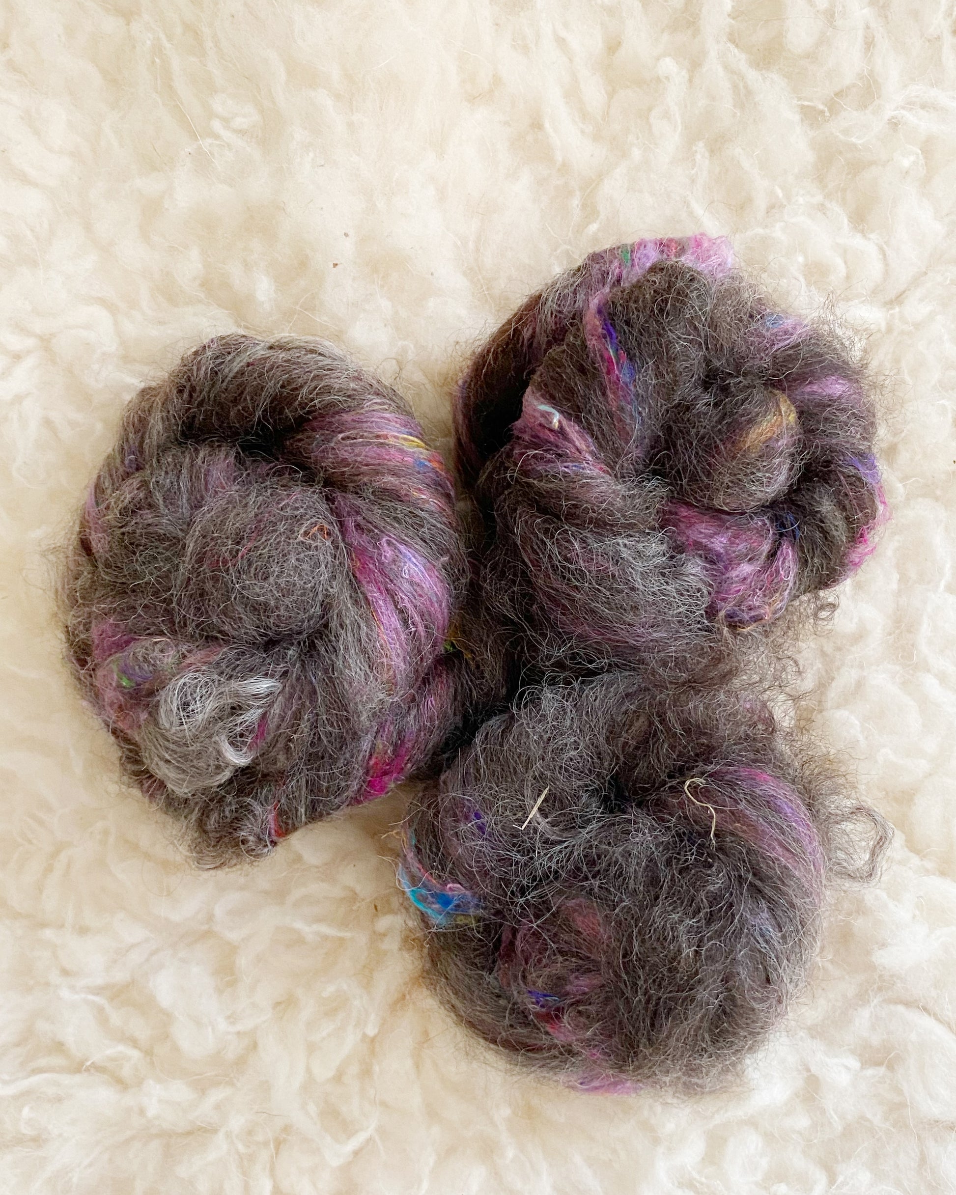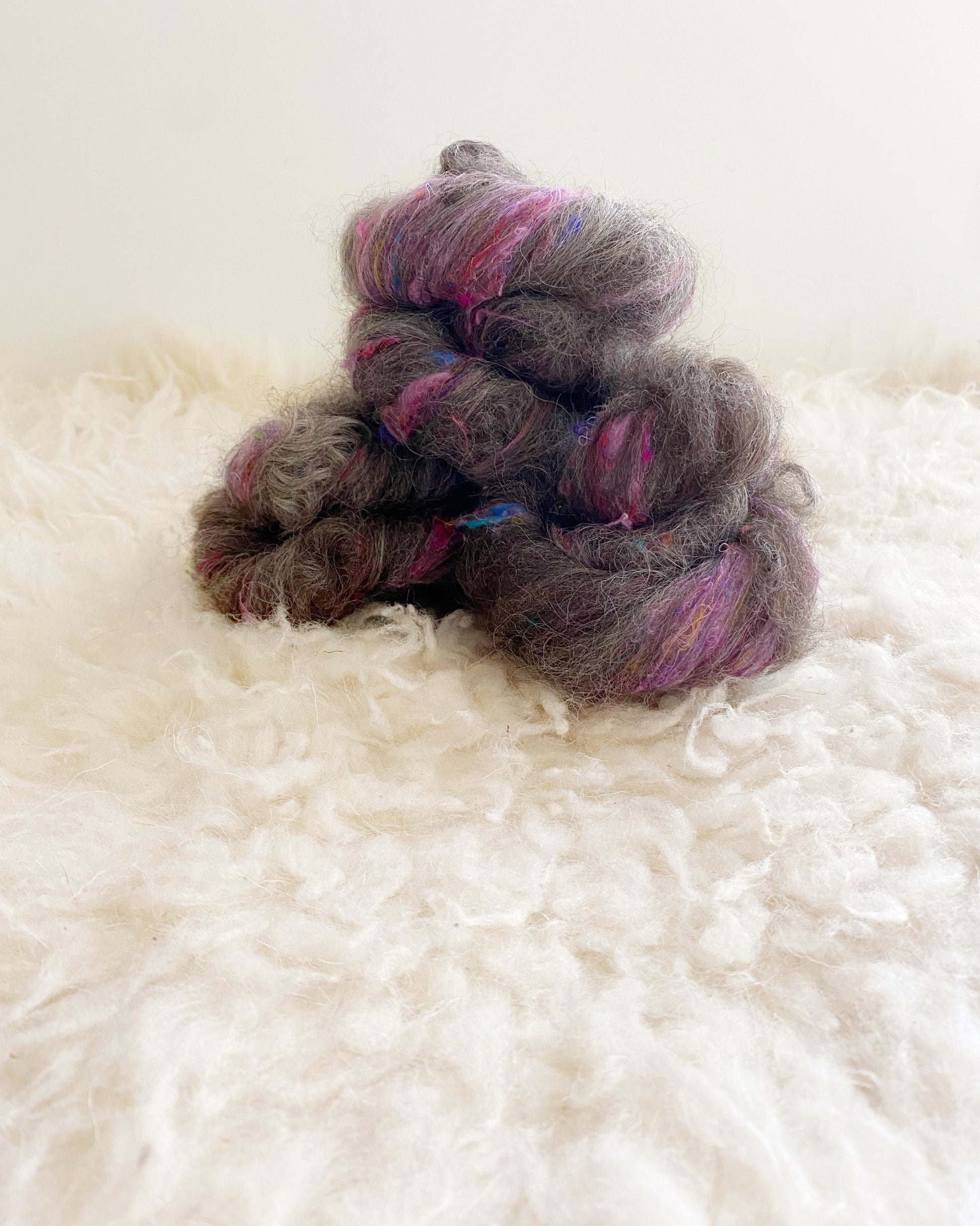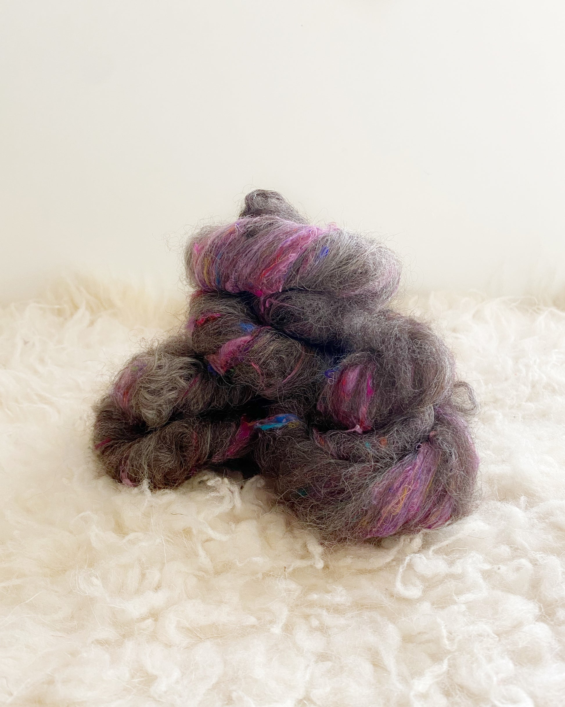 Dance among the stars with Starbreeze, a textured battling that combines the silvery elegance of grey Border Leicester wool with the playful texture of pink sari silk. Border Leicester wool, celebrated for its long, lustrous locks and soft sheen, offers a silky texture that spins like a dream. The soft grey tones of the wool evoke the glow of moonlight on a tranquil evening, while the vibrant pink sari silk streaks through like bursts of stardust, infusing every fiber with a touch of cosmic magic. Starbreeze is a celestial delight, inviting you to craft with wonder.